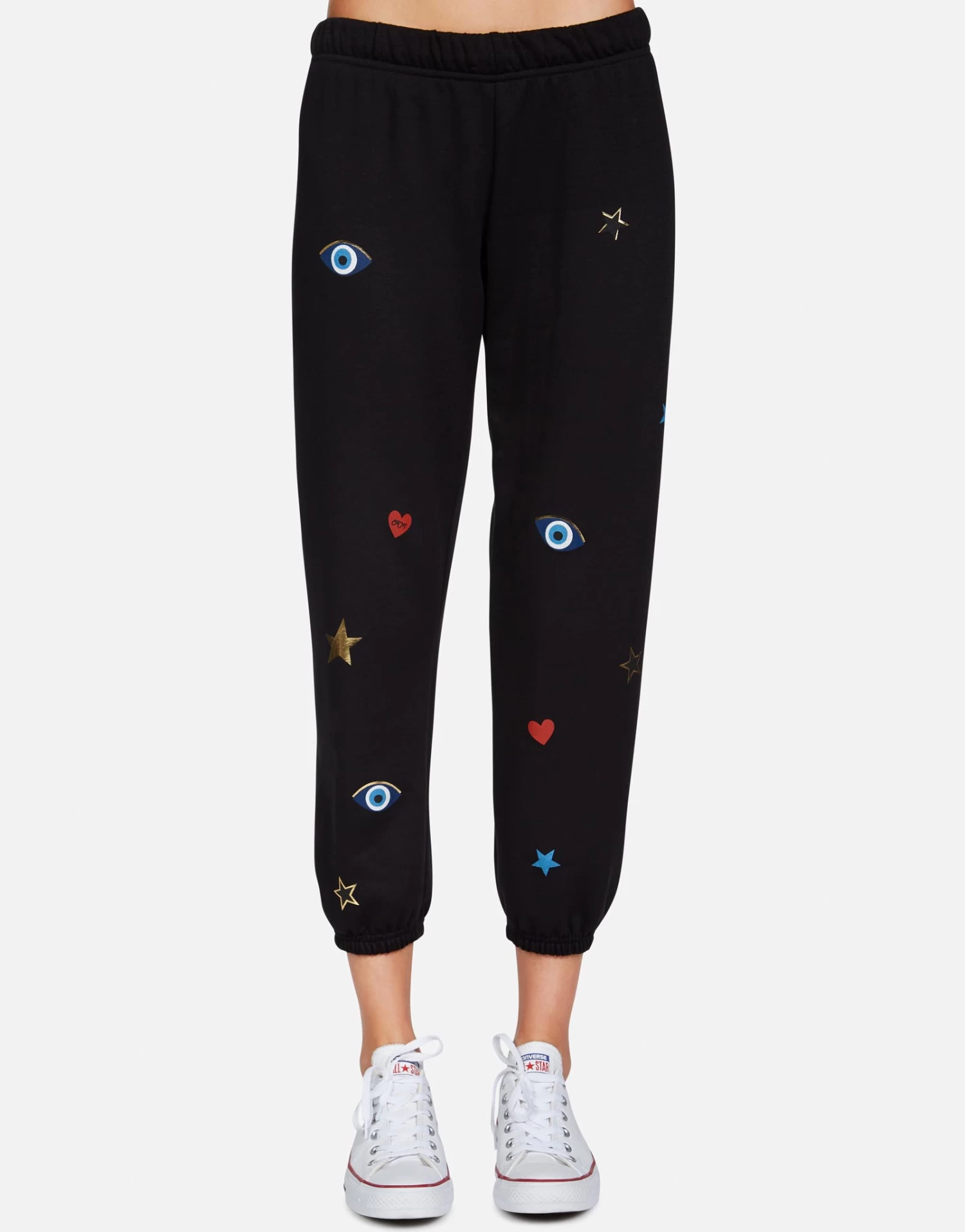 Evil Eye Elements Printed on Ultra Soft Lightweight Sweatpant in Black by Lauren Moshi.