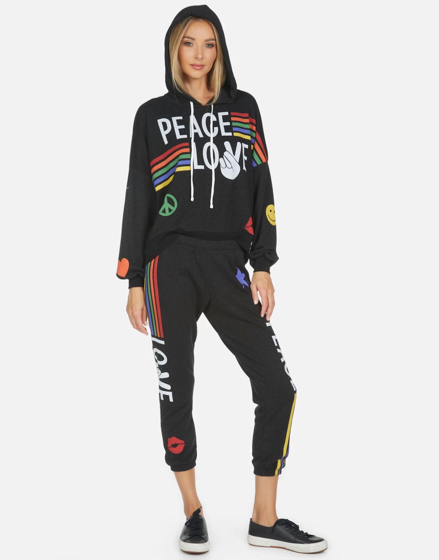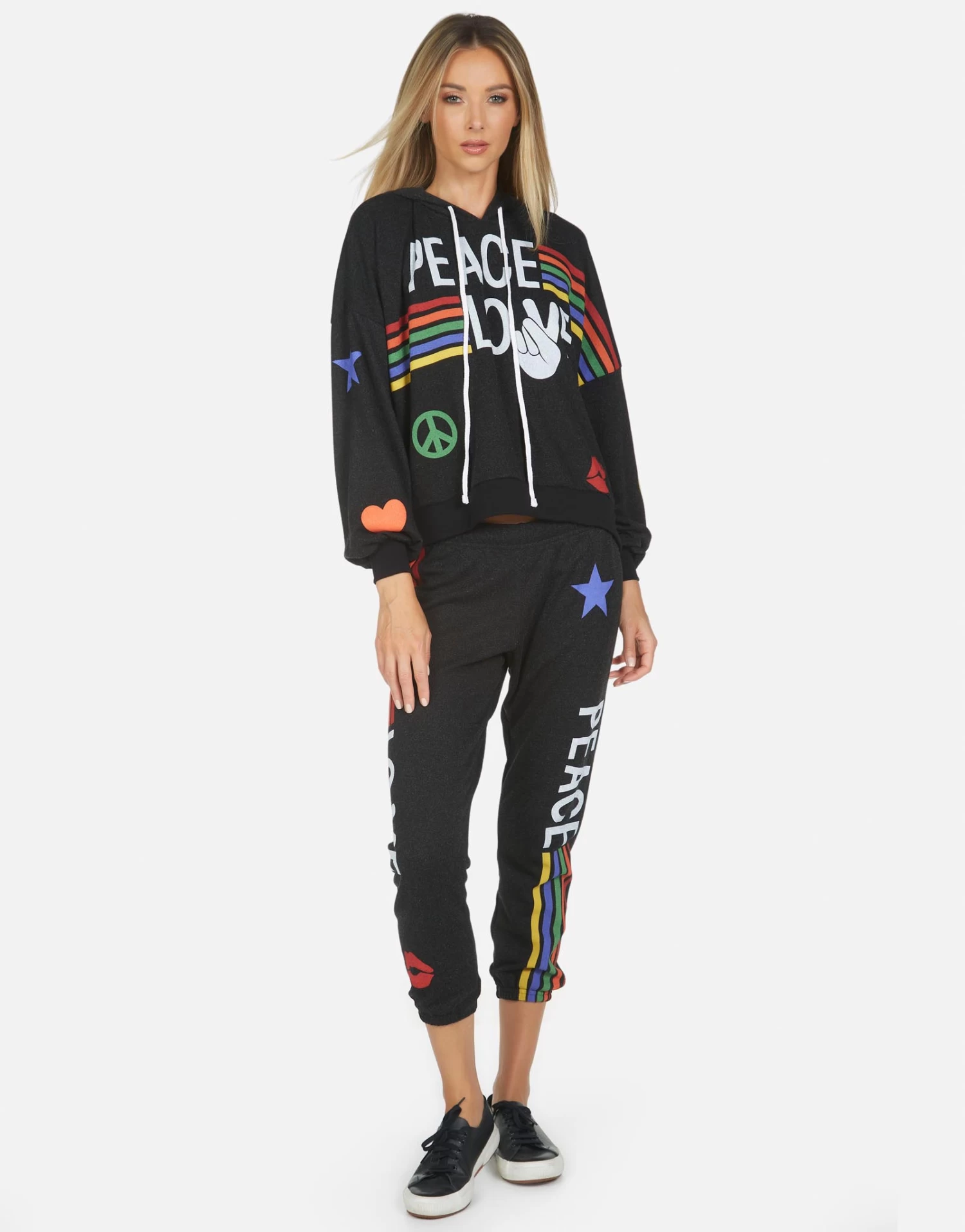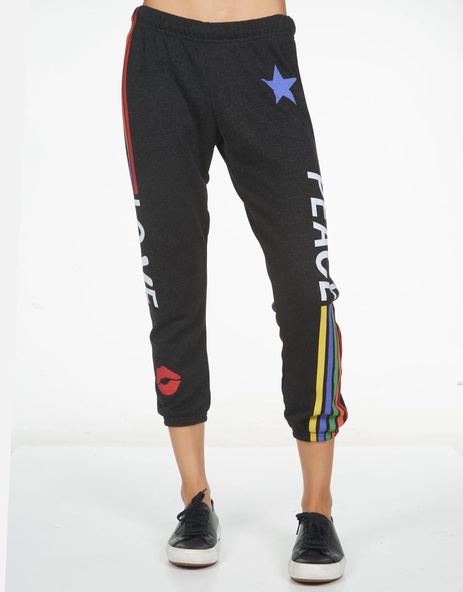 Peace Love Stripe Printed on Ultra Soft Lightweight Sweatpant in Black by Lauren Moshi.