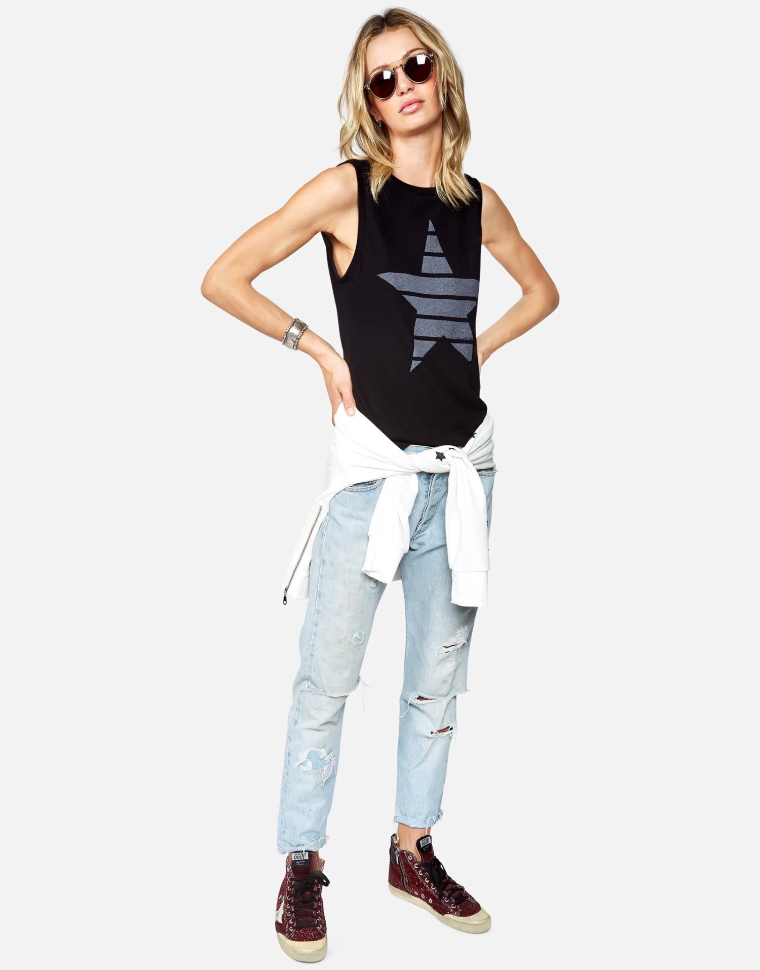 Classic Stripe Star Printed on Ultra Soft Lightweight Tank Tee in Black by Lauren Moshi.