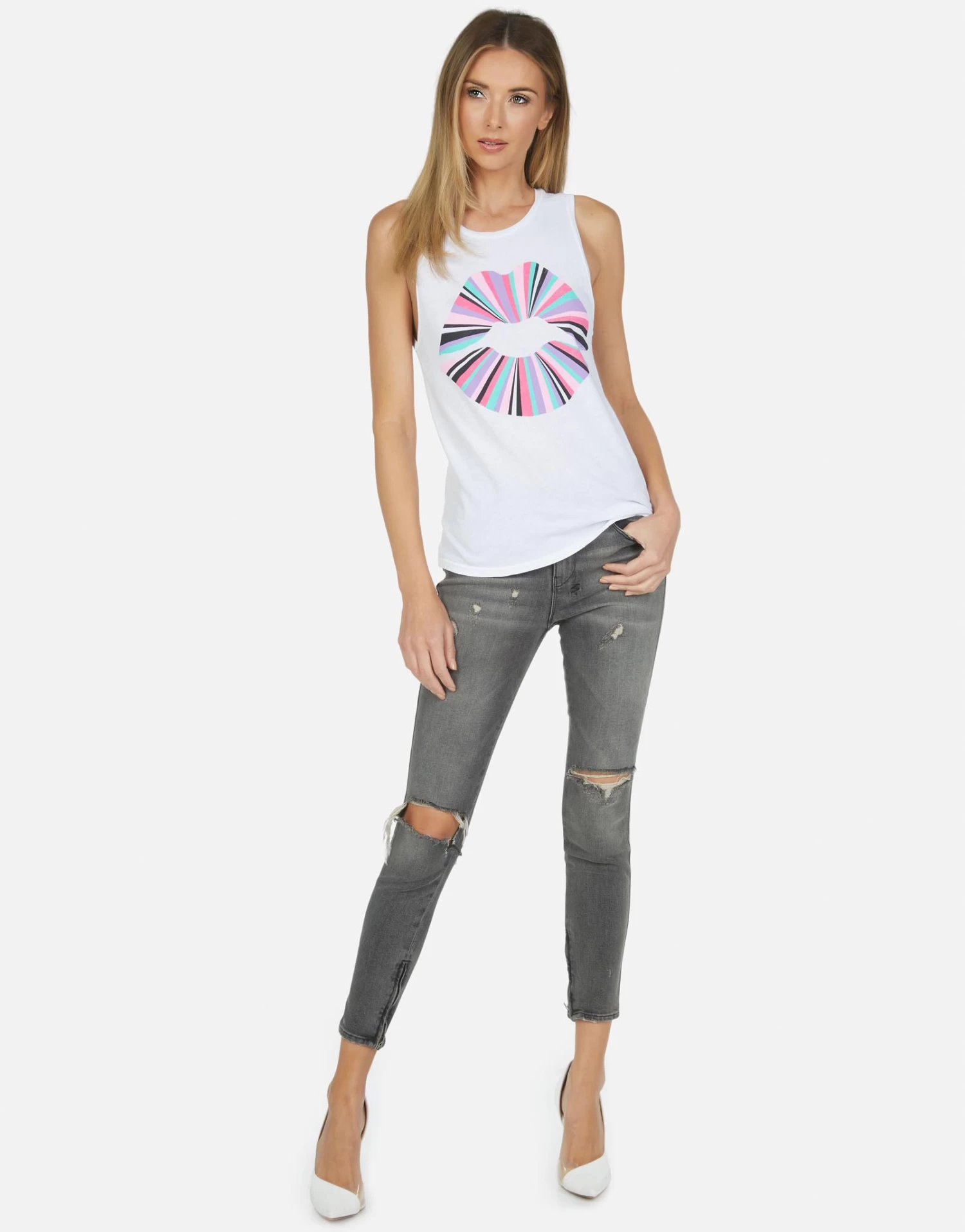 Rainbow Ray Peace Printed on Ultra Soft Lightweight Tee in White by Lauren Moshi.