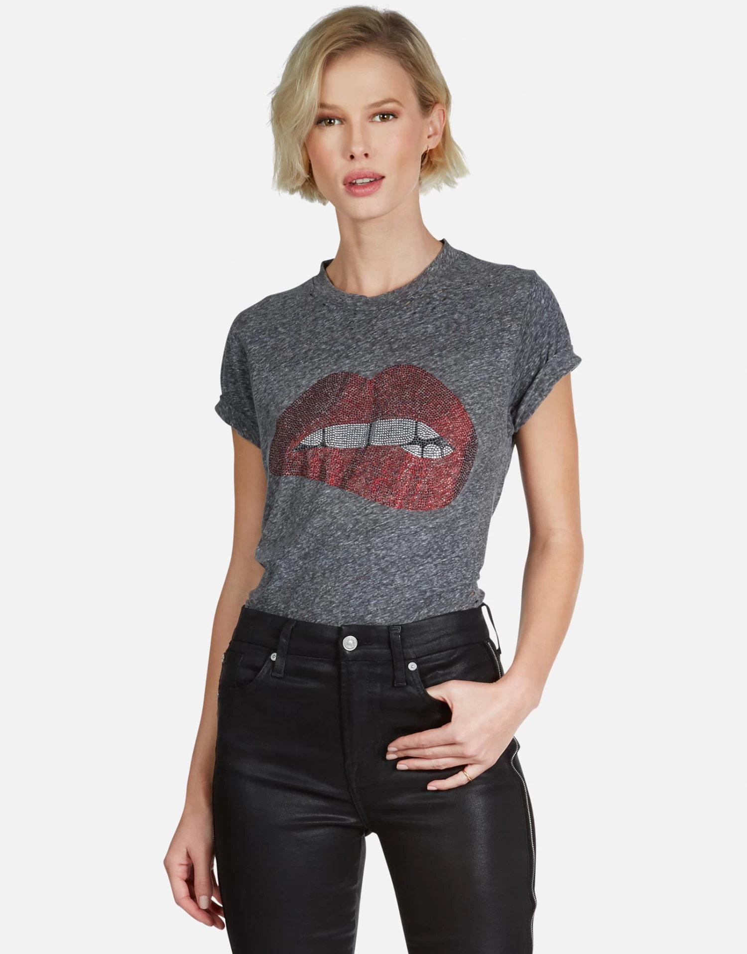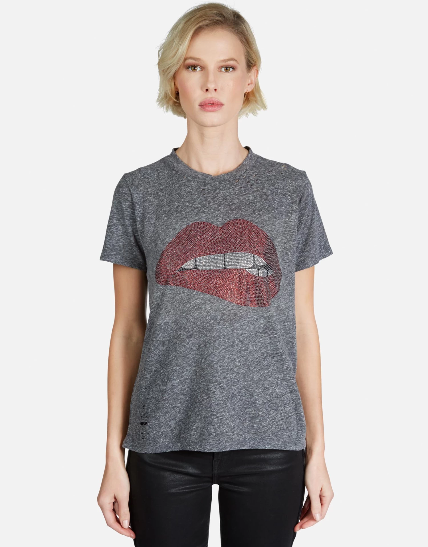 Rainbow Biting Lip Printed on Ultra Soft Lightweight Tee in Heather Grey by Lauren Moshi.