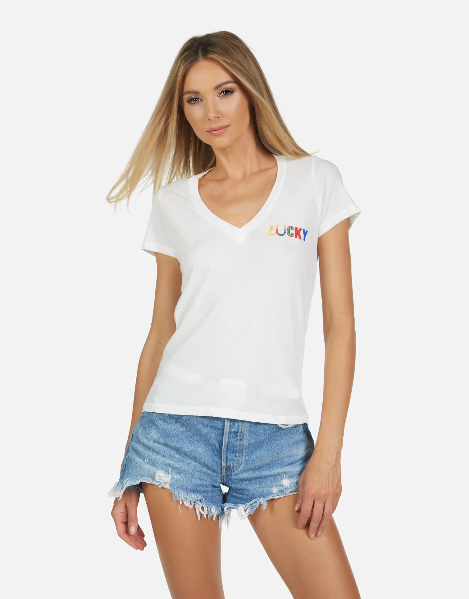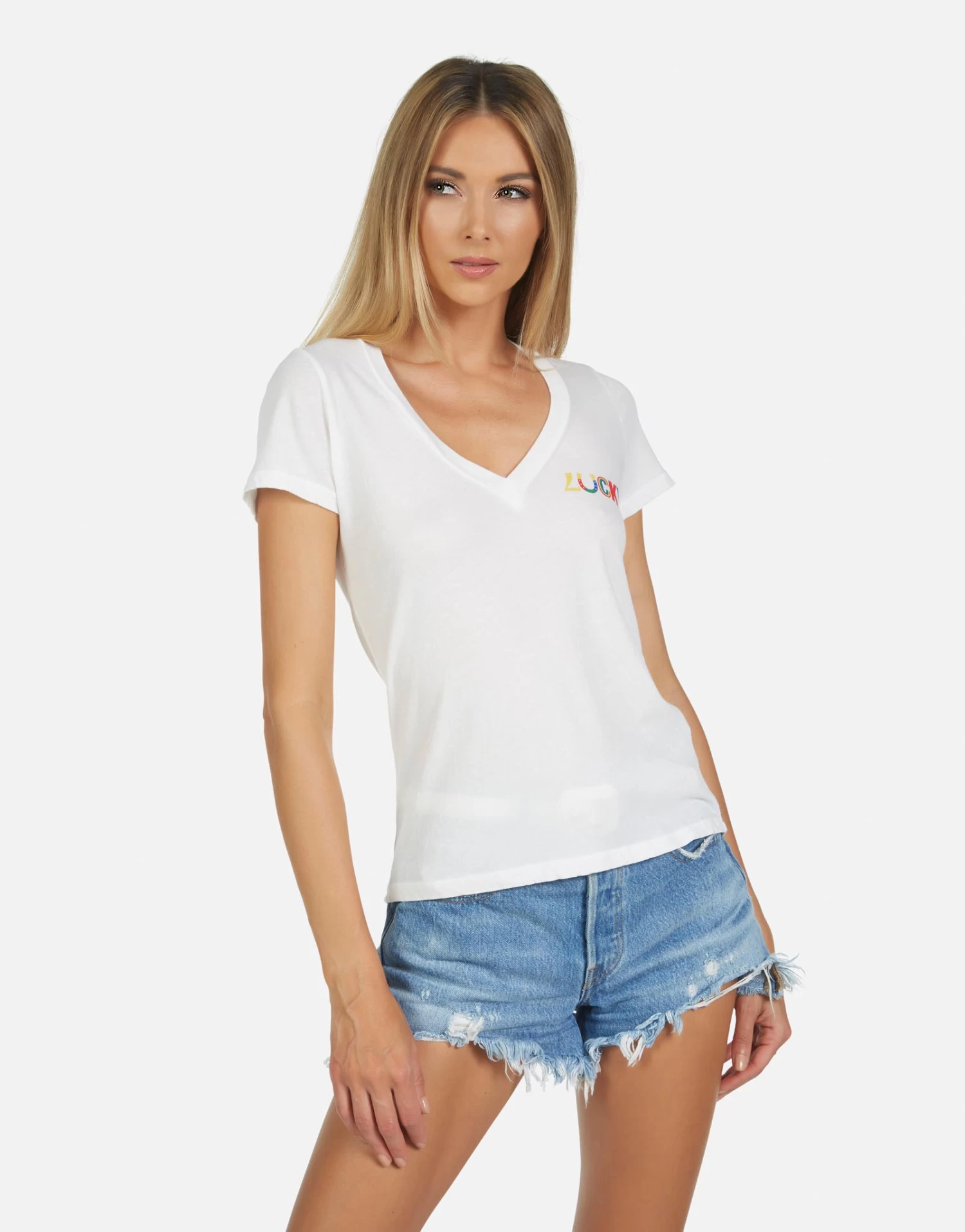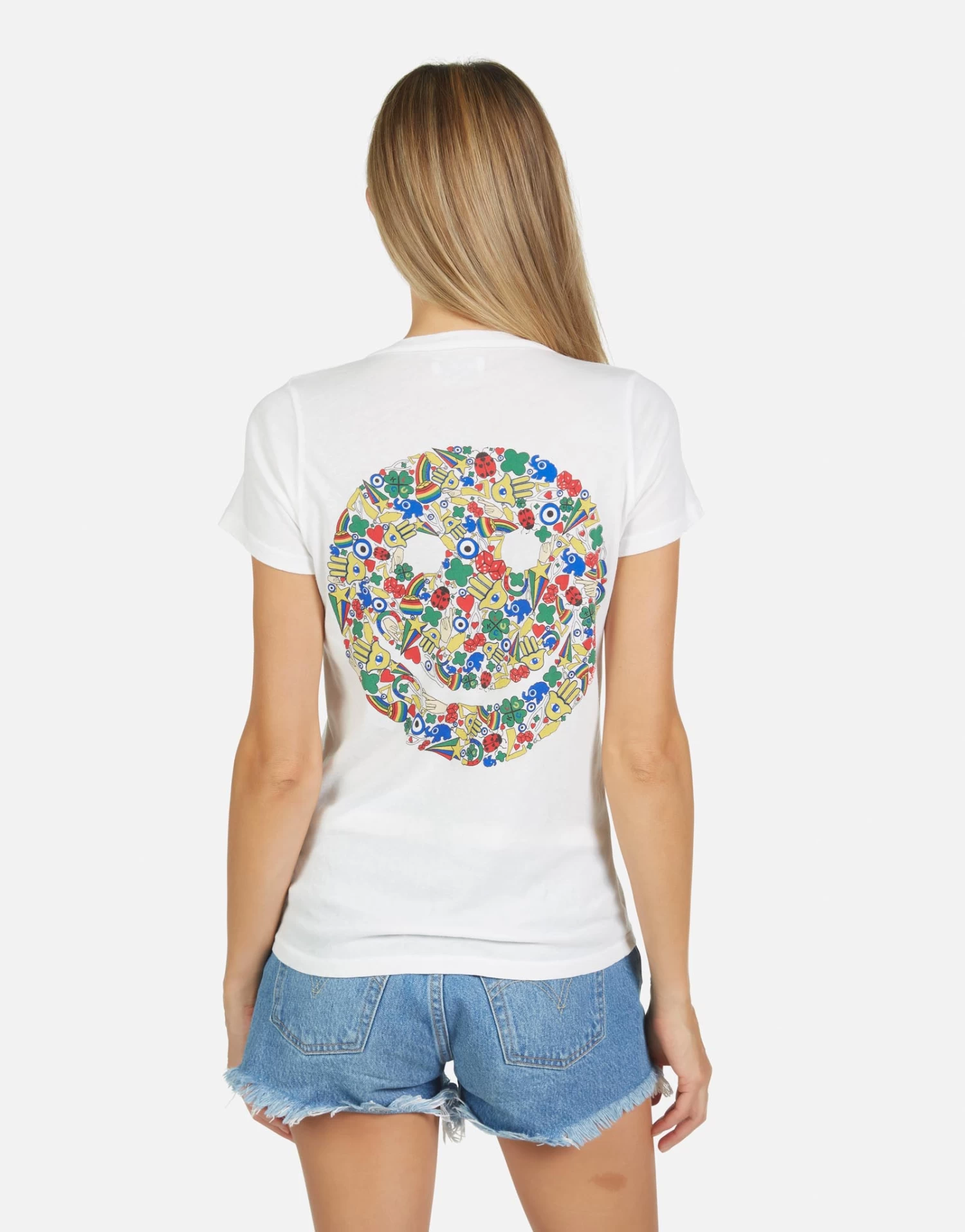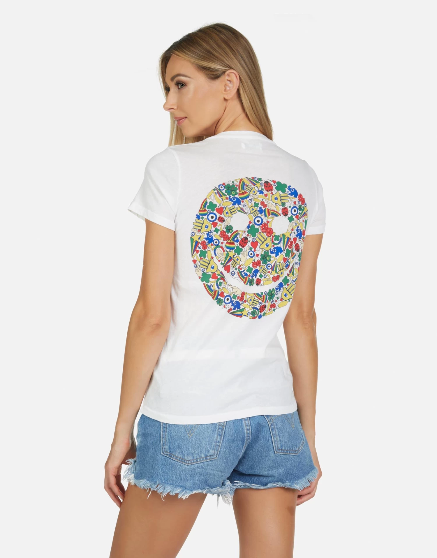 Lucky Happy Face Printed on Ultra Soft Lightweight Tee in Milk by Lauren Moshi.