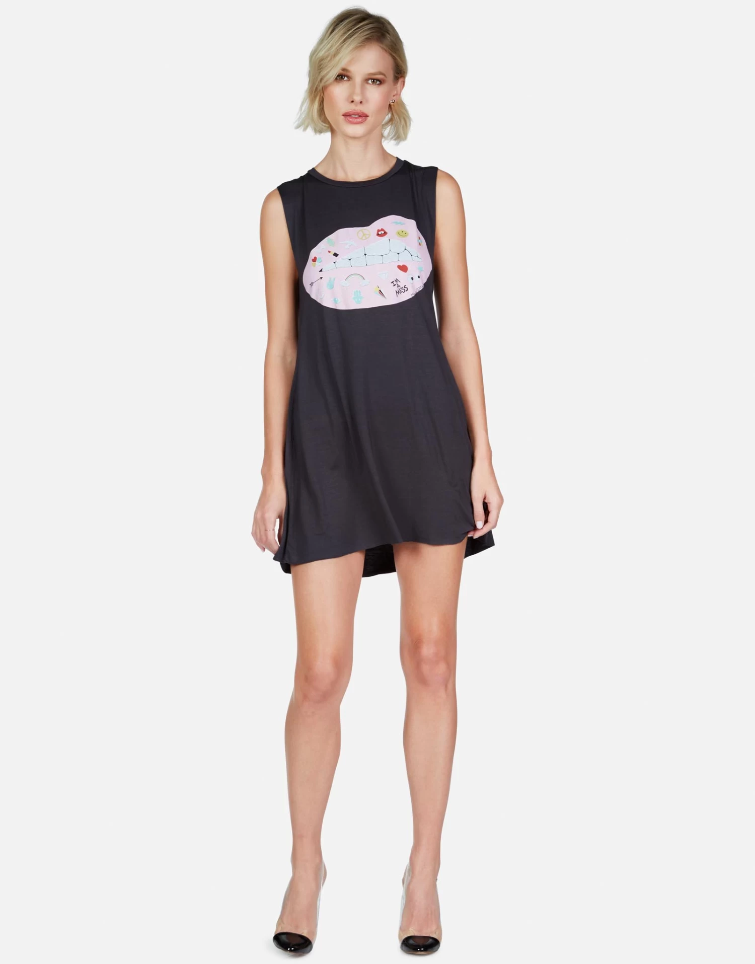 Color Elements Lip Printed on Ultra Soft Lightweight Mini Dress in Onyx by Lauren Moshi.