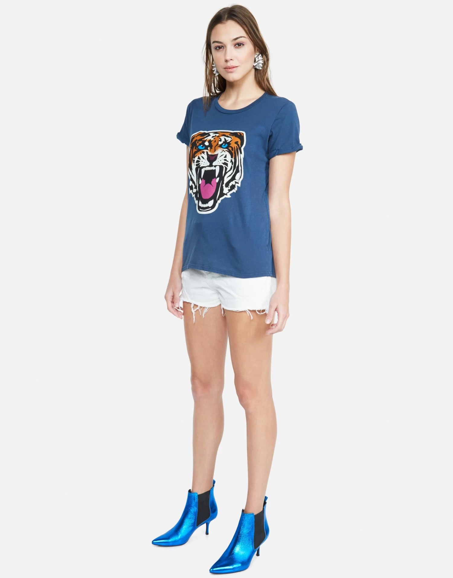 Color Varsity Tiger Printed on Ultra Soft Lightweight Tee in Denim Night by Lauren Moshi.