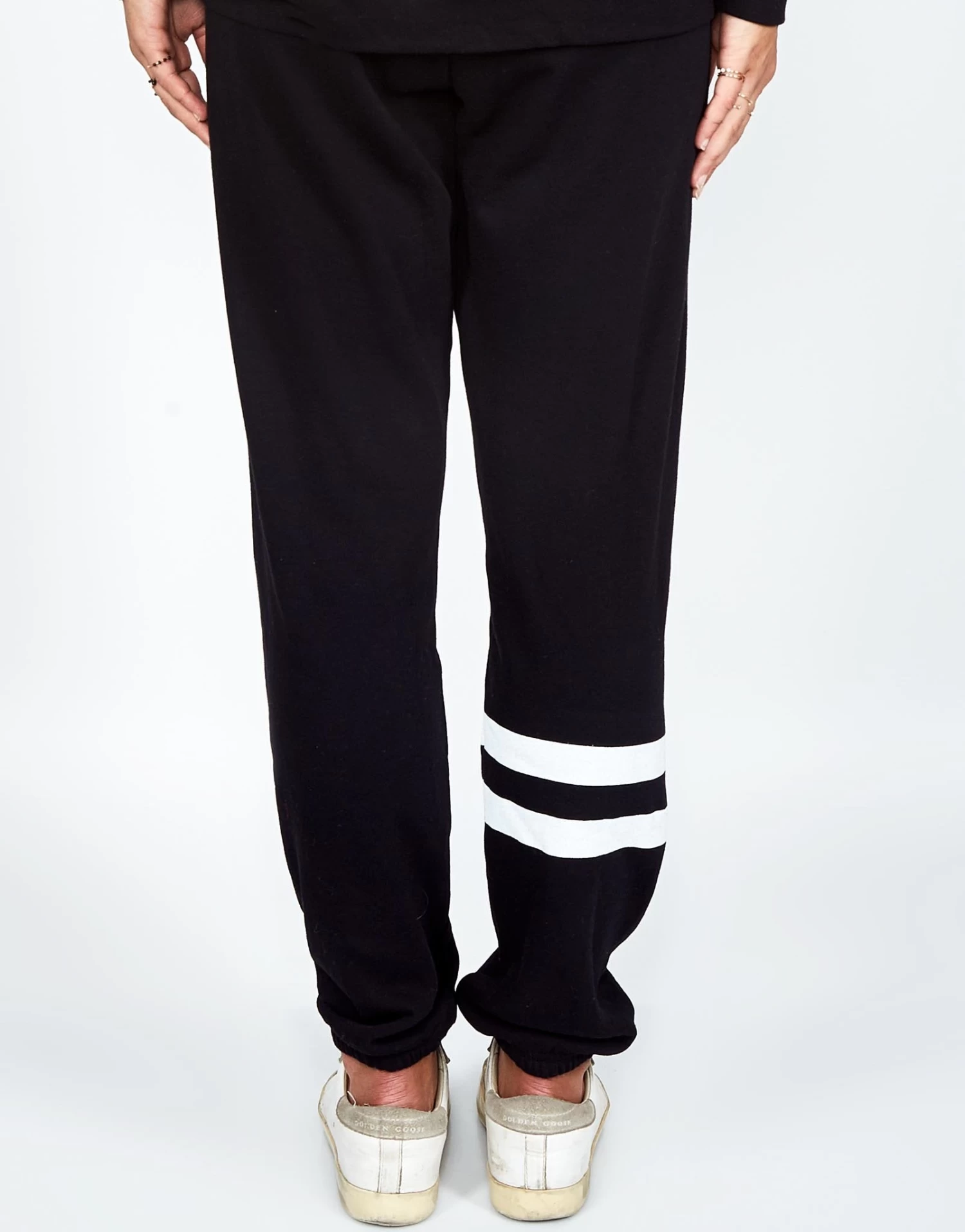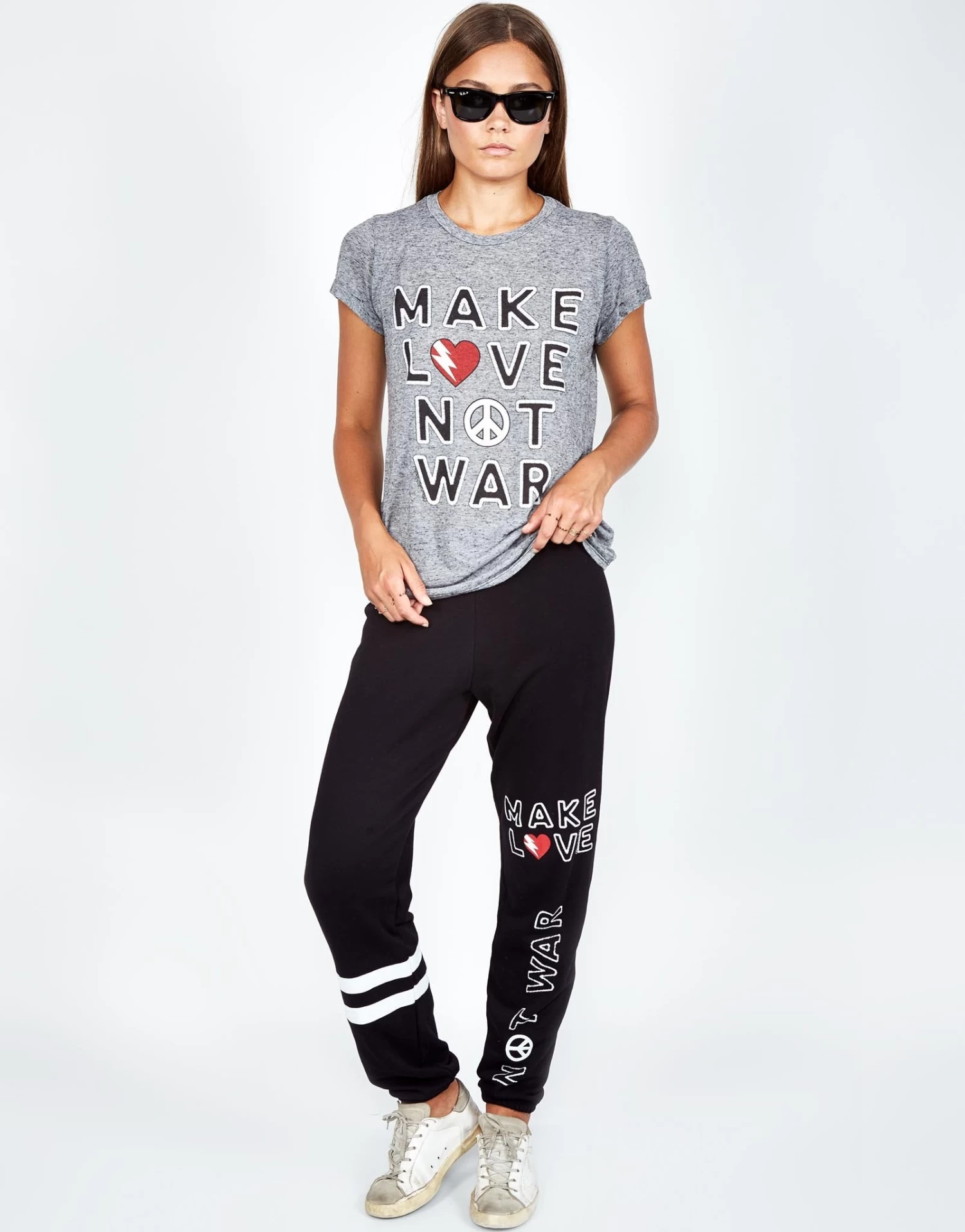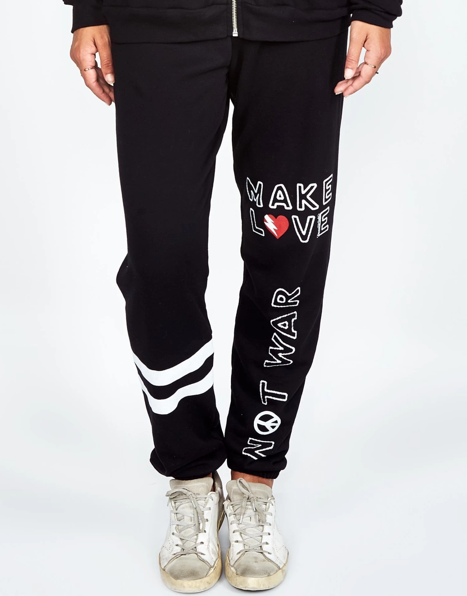 Make Love Not War w/ Stripes Printed on Ultra Soft Lightweight Sweatpant in Black by Lauren Moshi.