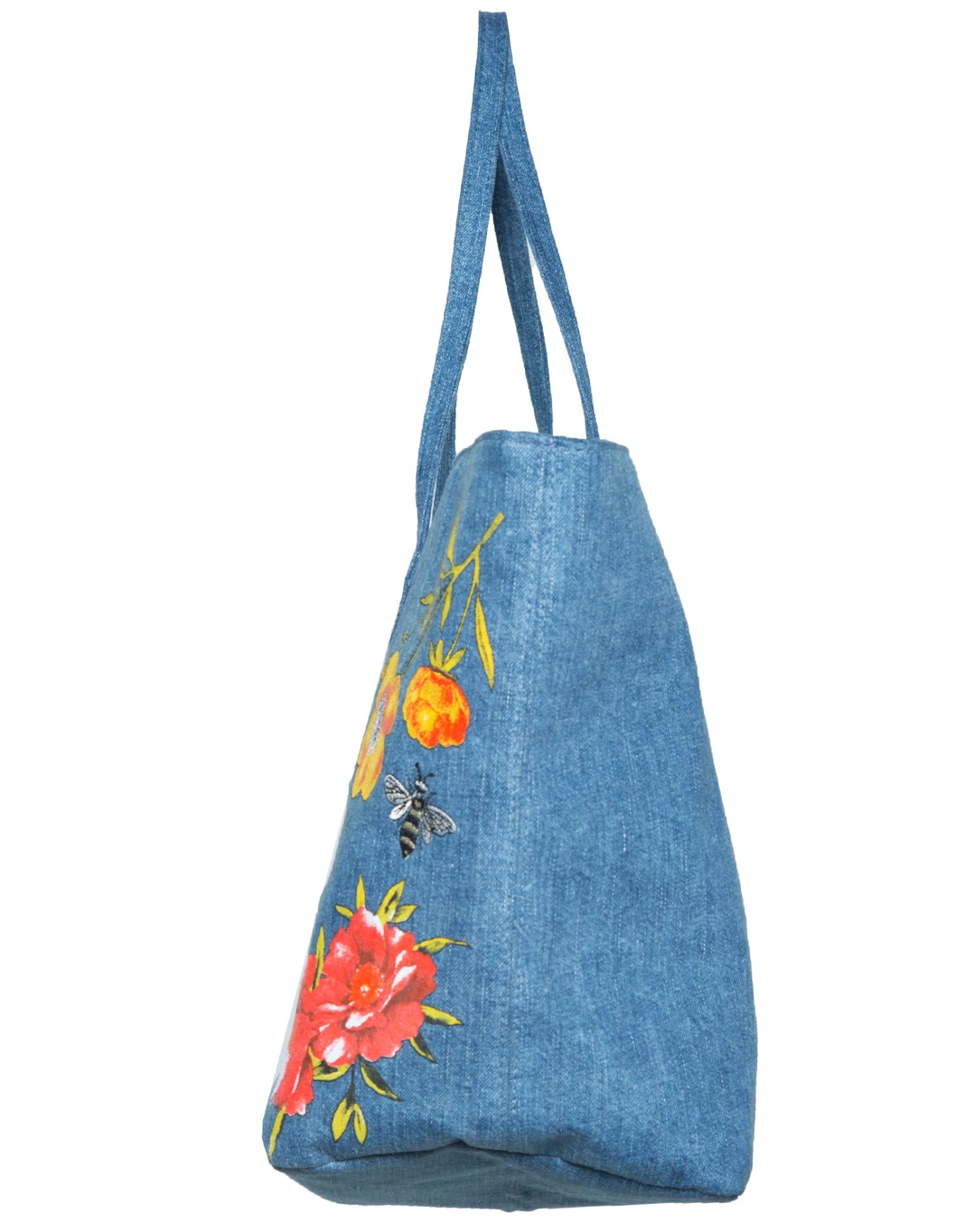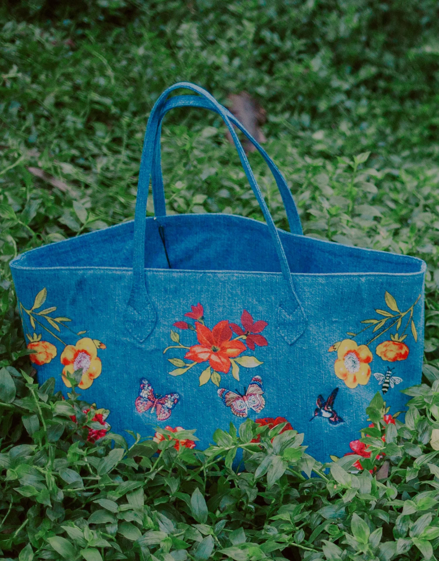 Printed Flowers, Birds & Butterflies Luxury Women’s Tote Bag w/ Patches in Hada Mada Denim by Lauren Moshi.