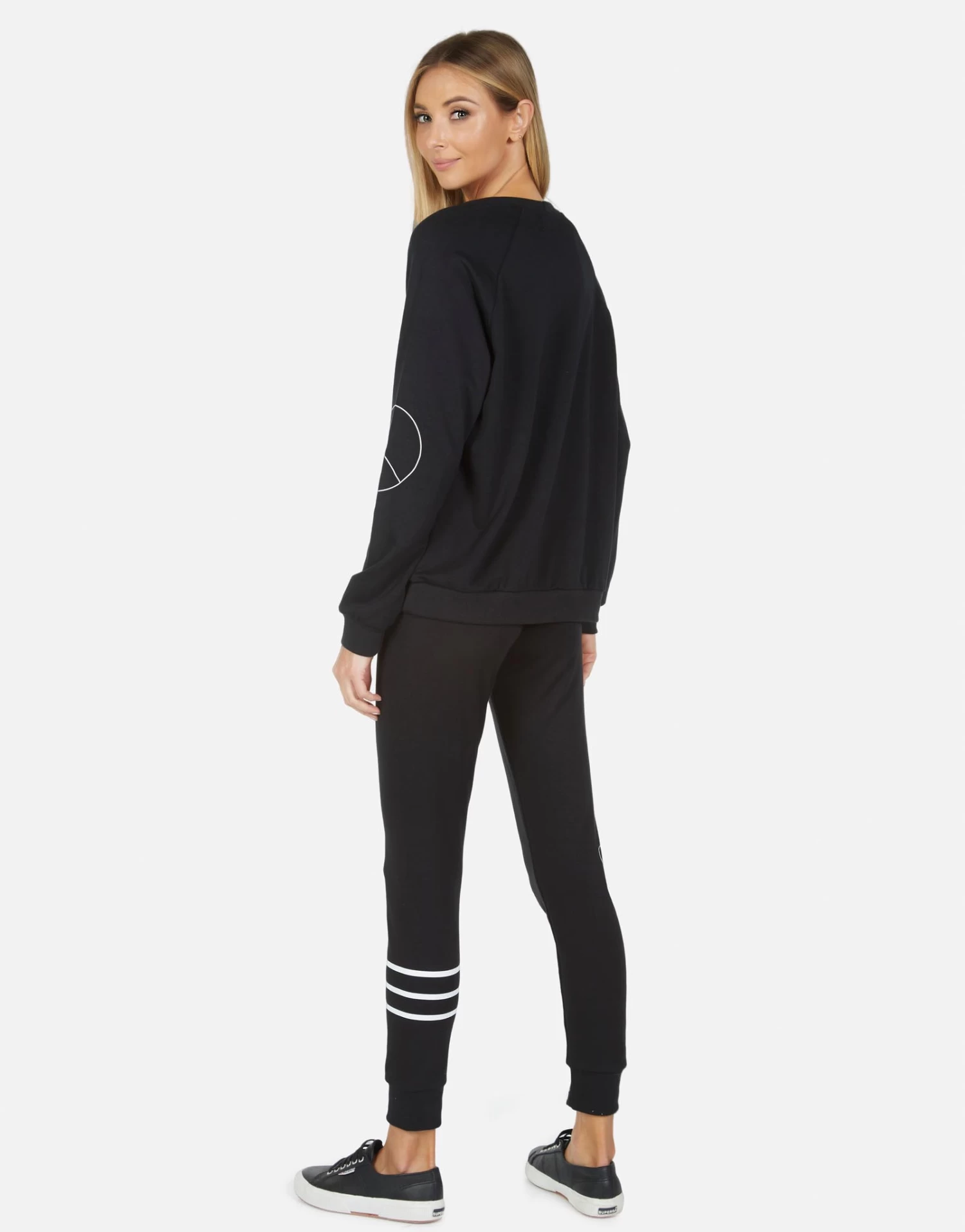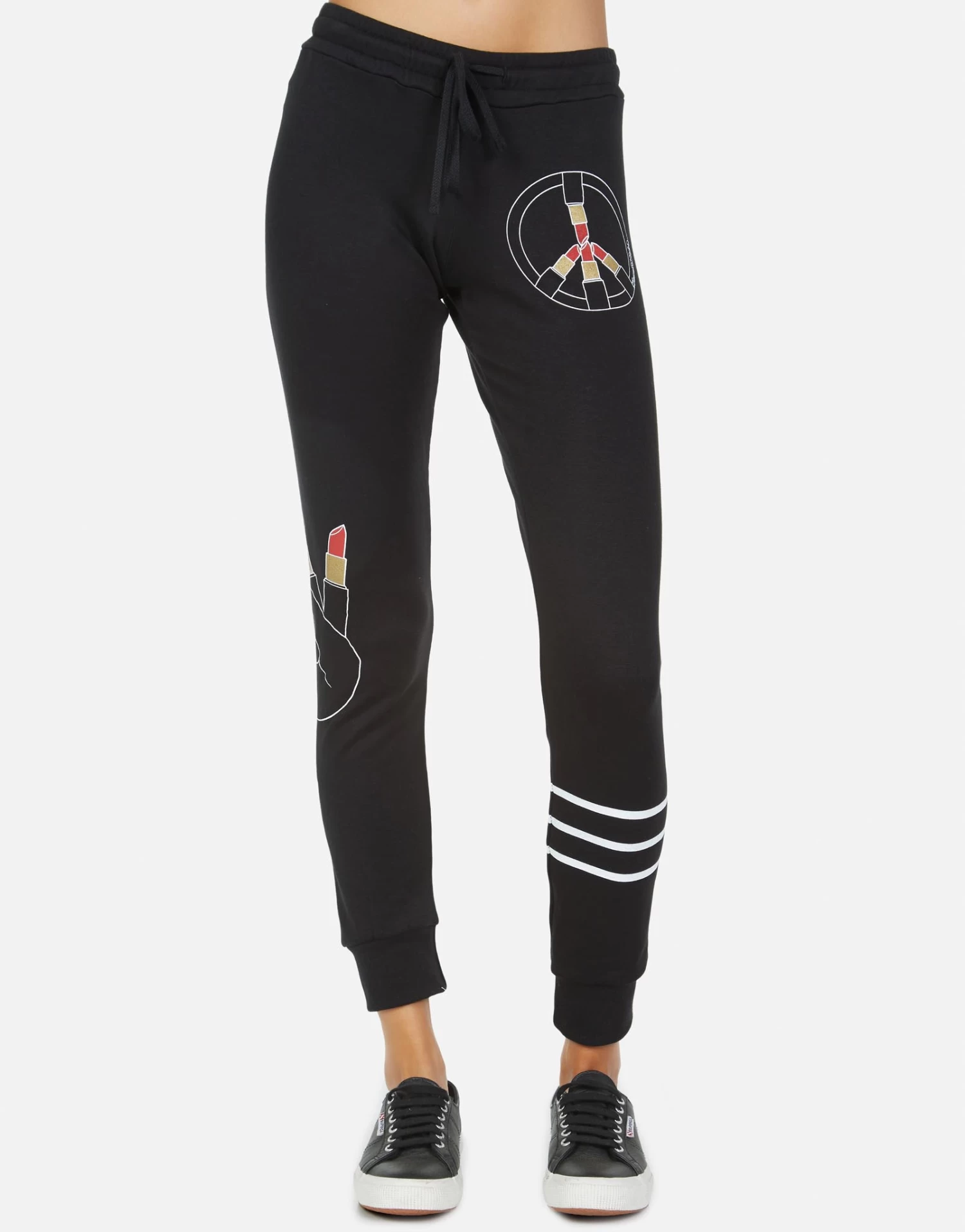 Lipstick Peace Printed on Ultra Soft Lightweight Sweatpant in Black by Lauren Moshi.