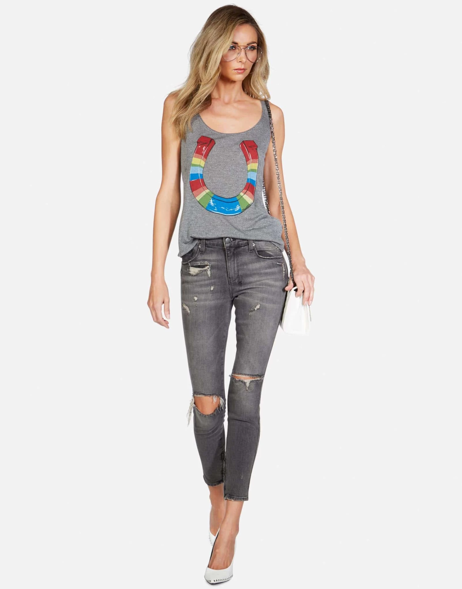 Rainbow Horseshoe Printed on Ultra Soft Lightweight Tank in Heather Grey by Lauren Moshi.