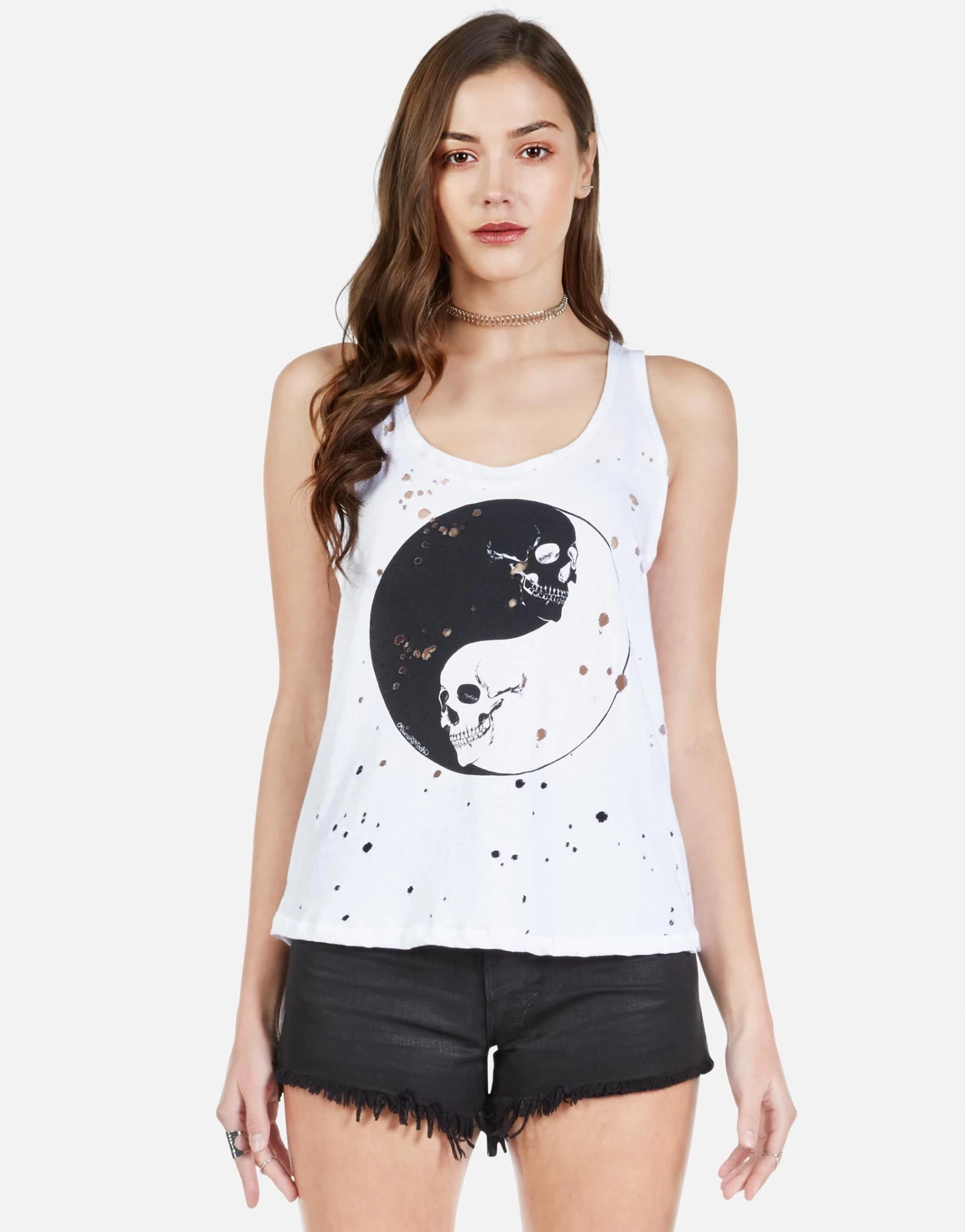 Skull Yin Yang Printed on Ultra Soft Lightweight Tank in White by Lauren Moshi.