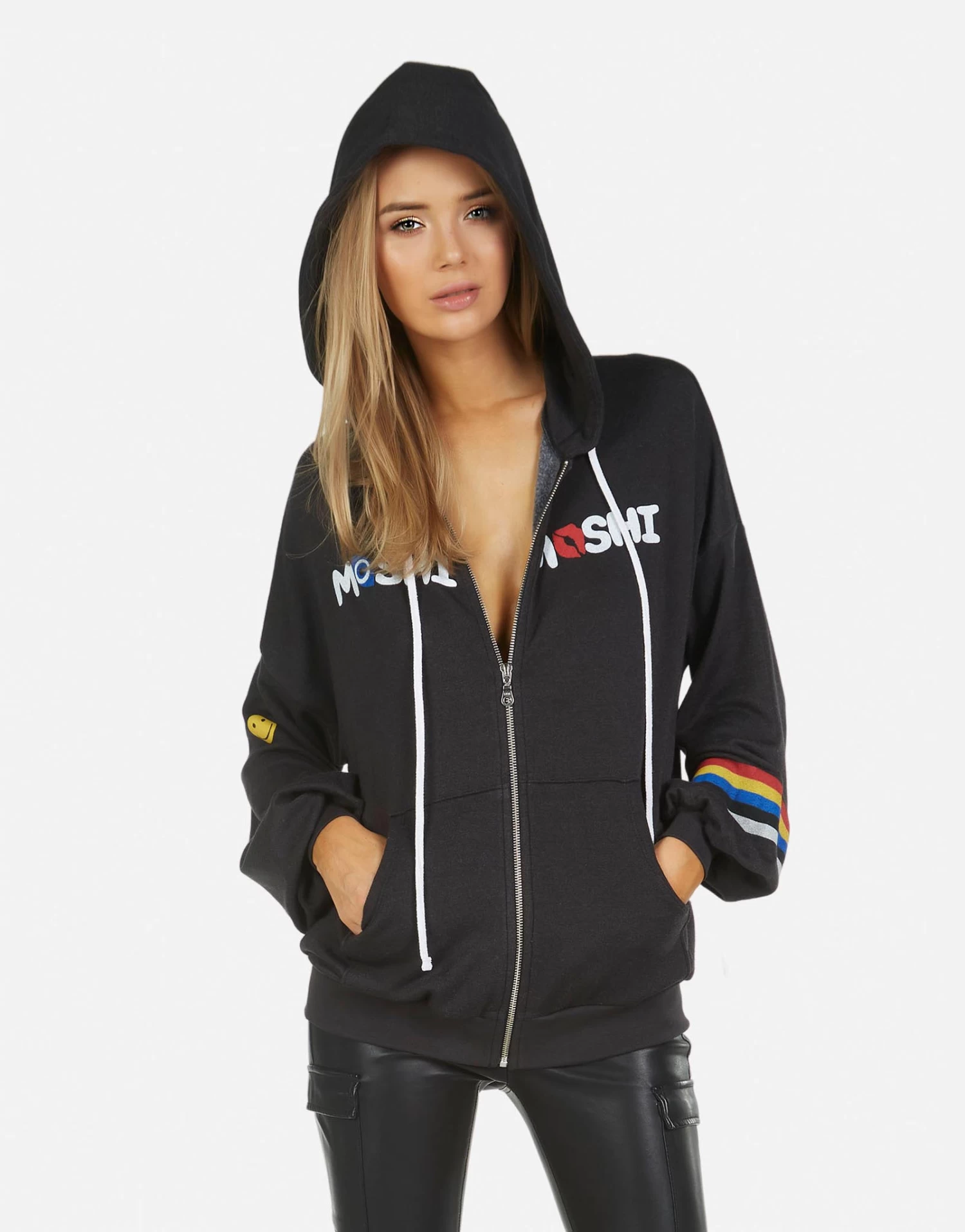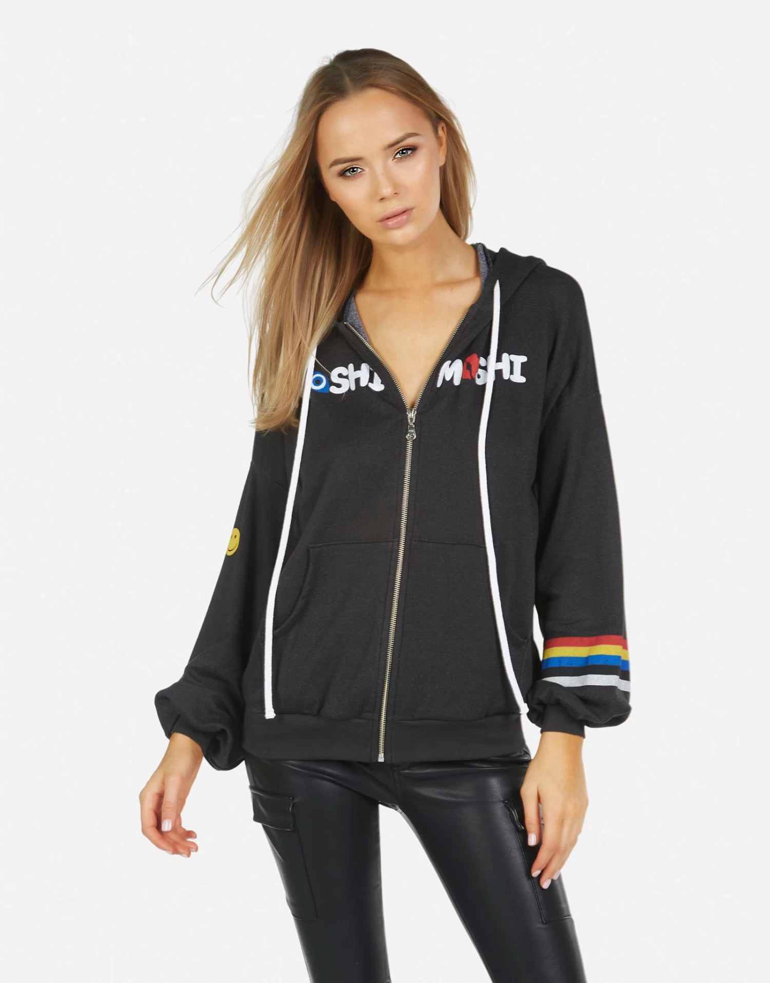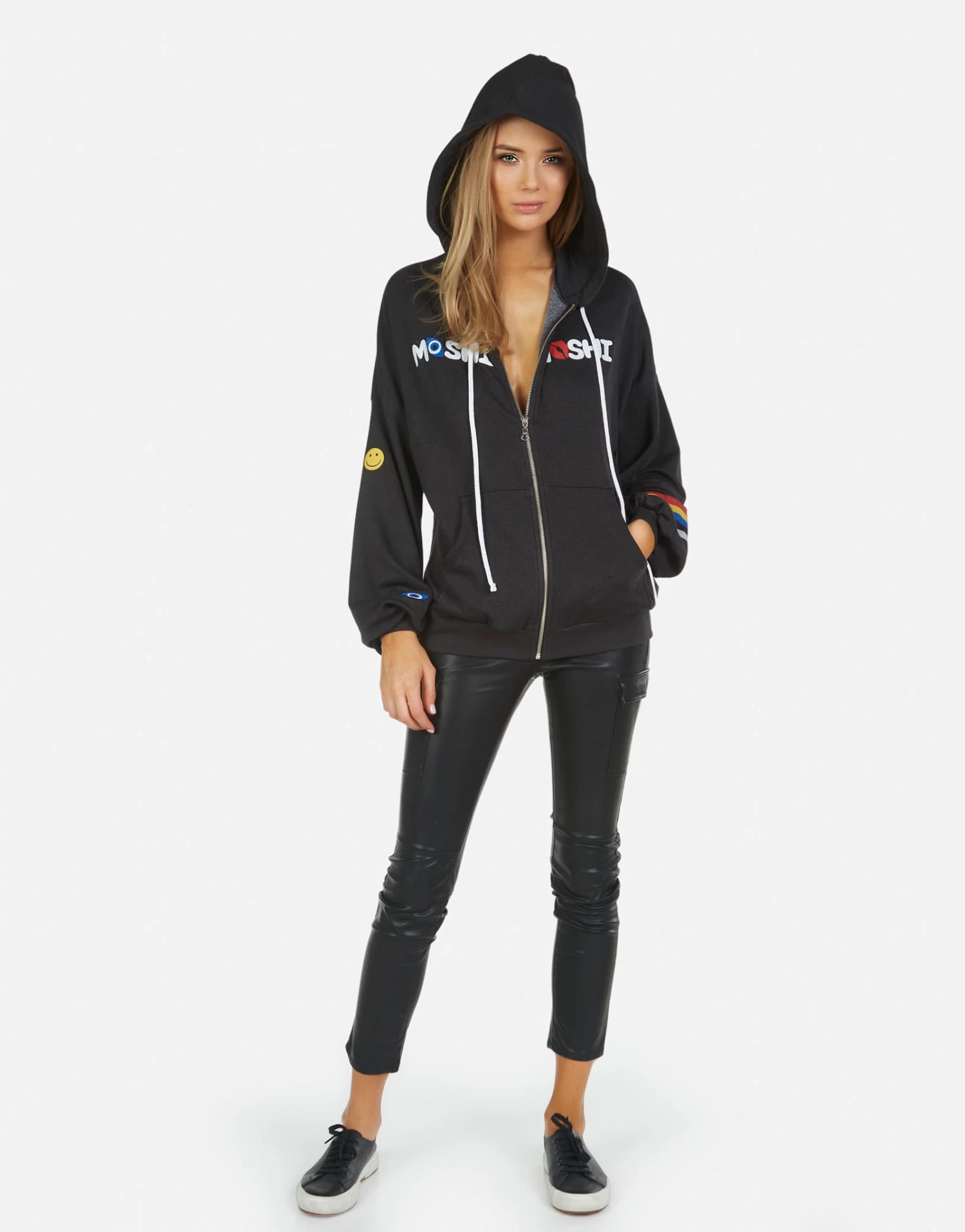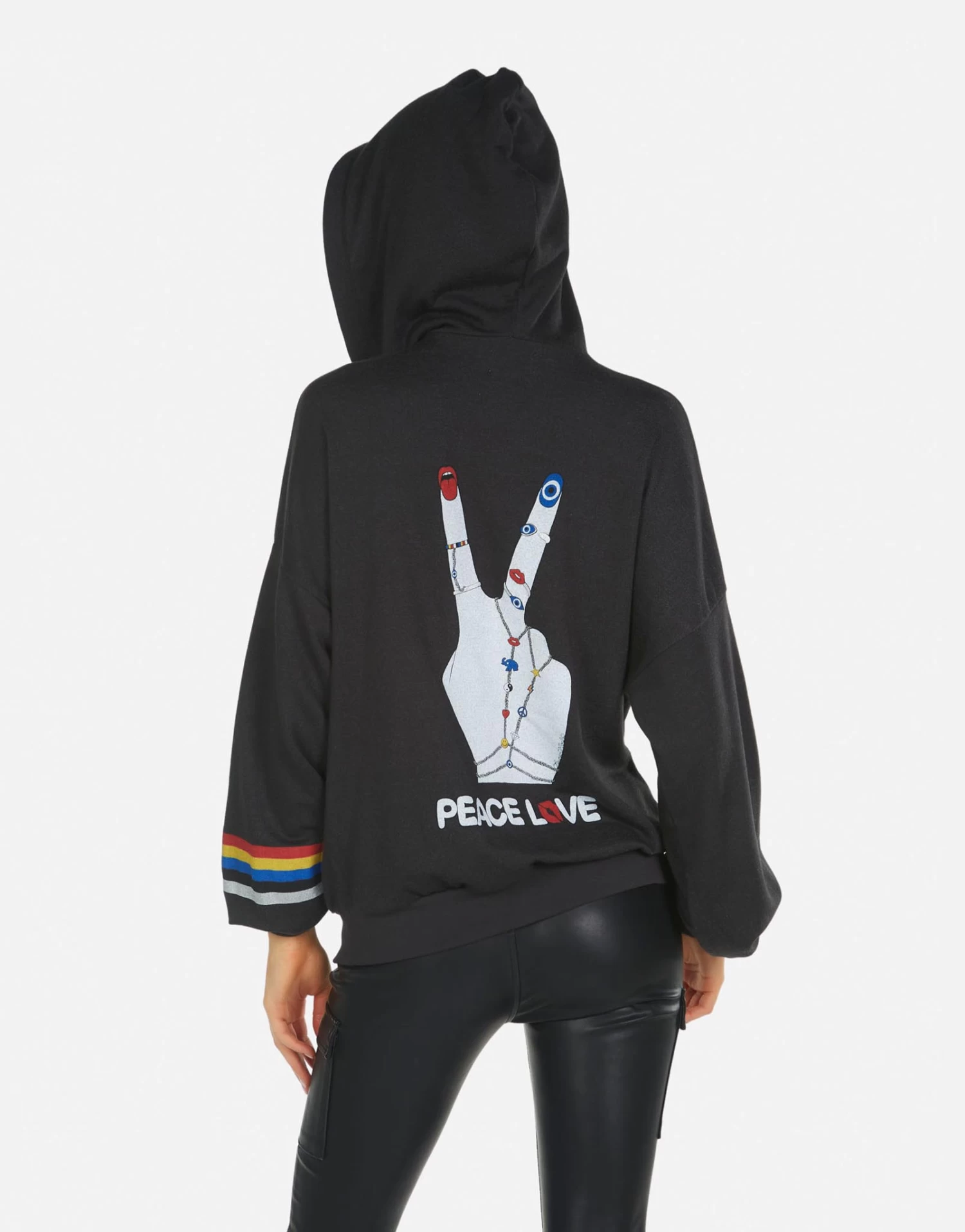 Peace Hand Elements Printed on Ultra Soft Lightweight Hoodie in Onyx by Lauren Moshi.