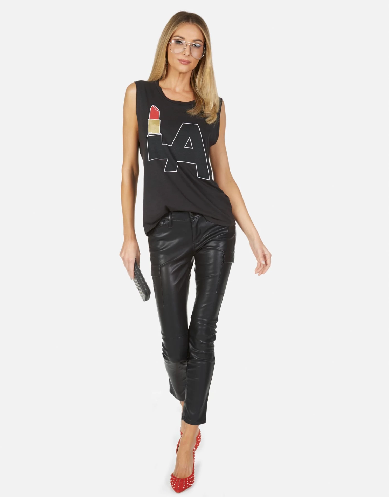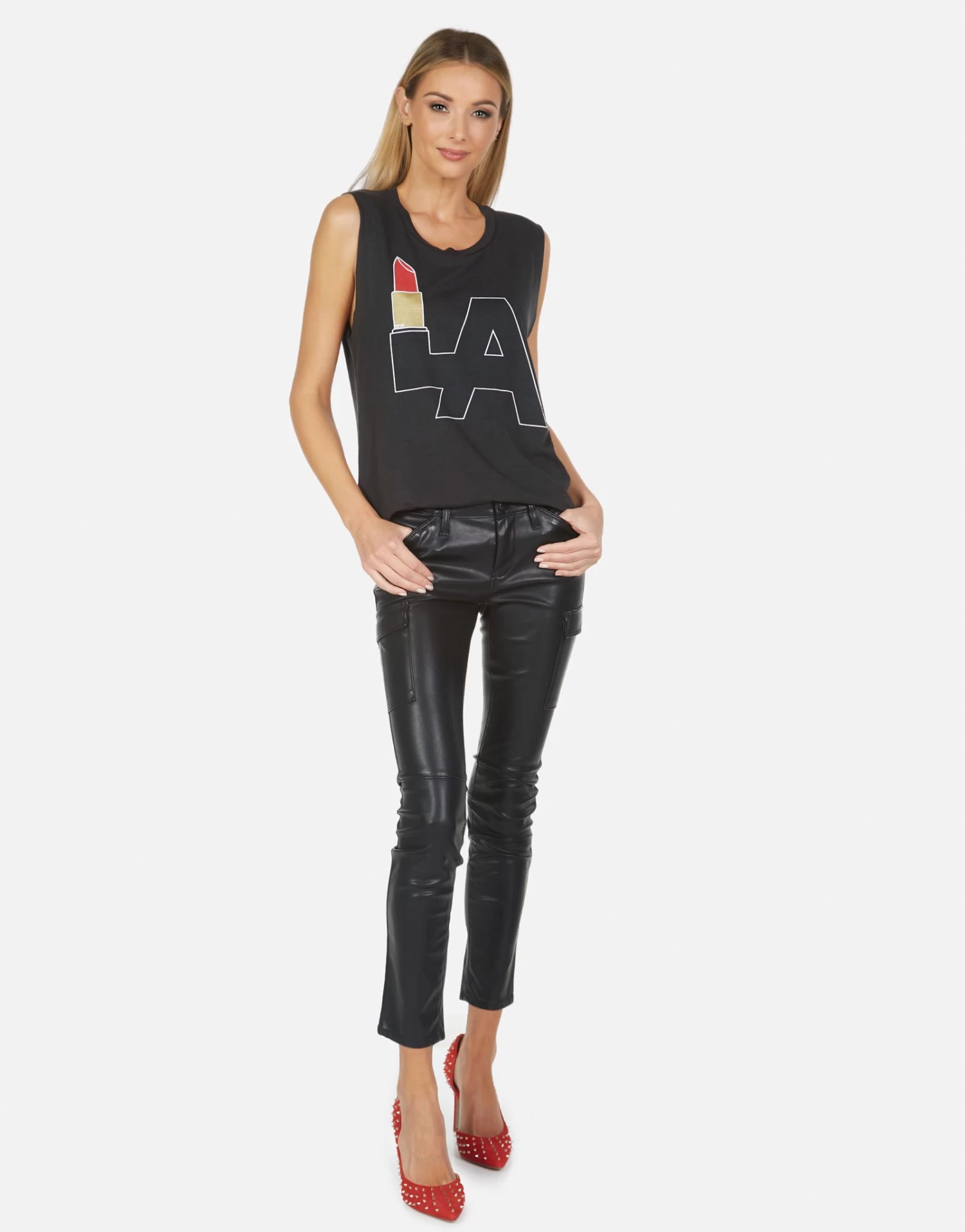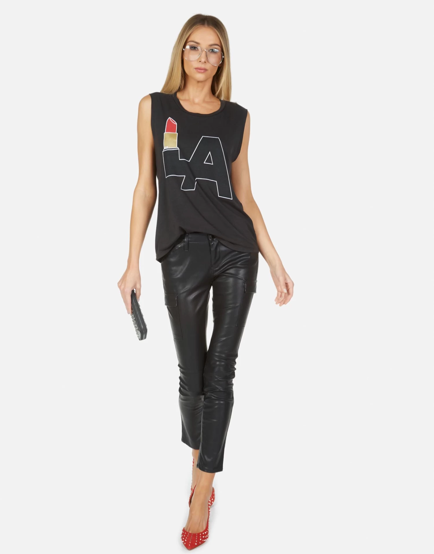 LA Lipstick Printed on Ultra Soft Lightweight Muscle Tank in Onyx by Lauren Moshi.