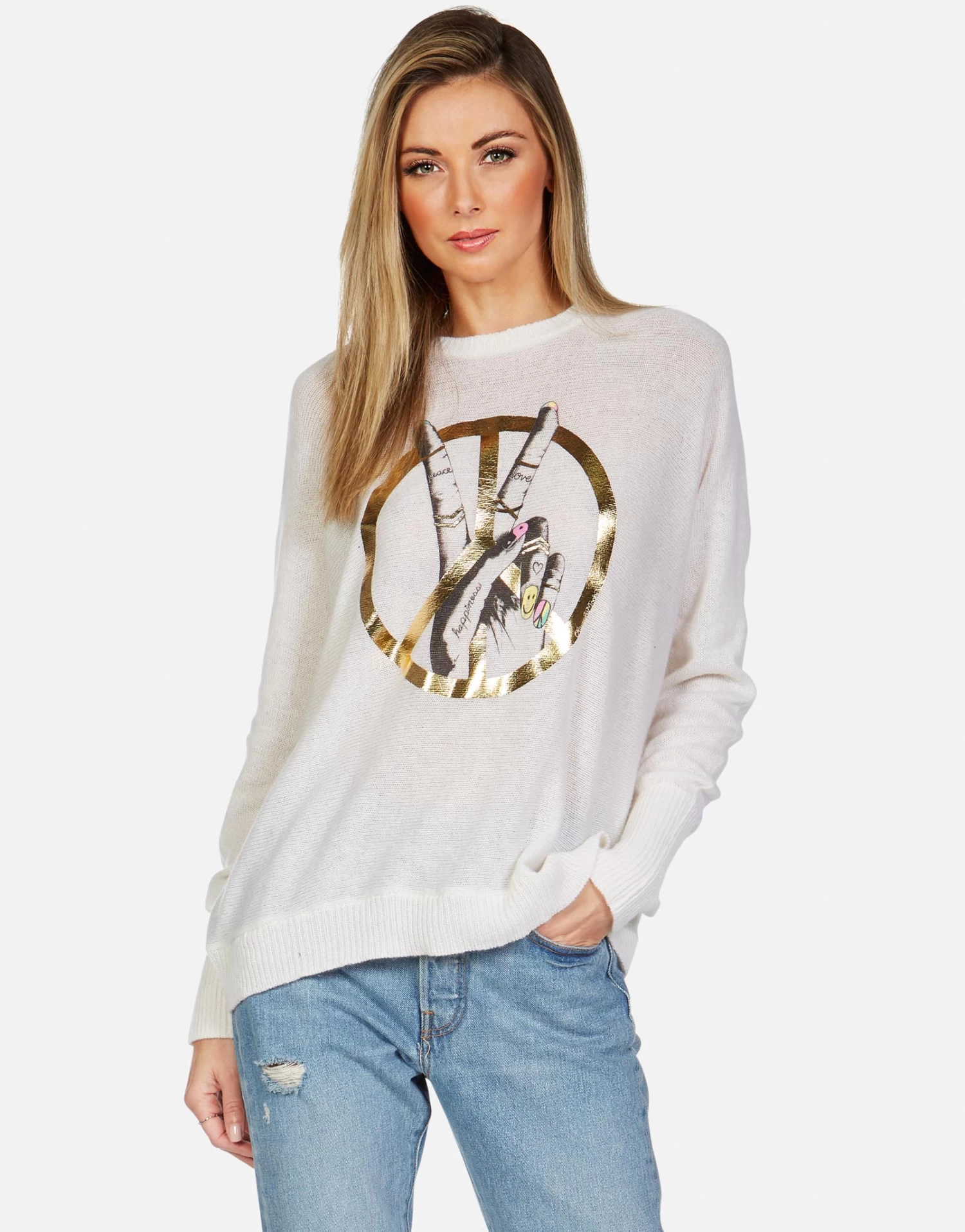 Peace Sign Hand Printed on Ultra Soft Cashmere Sweater in Creme by Lauren Moshi.