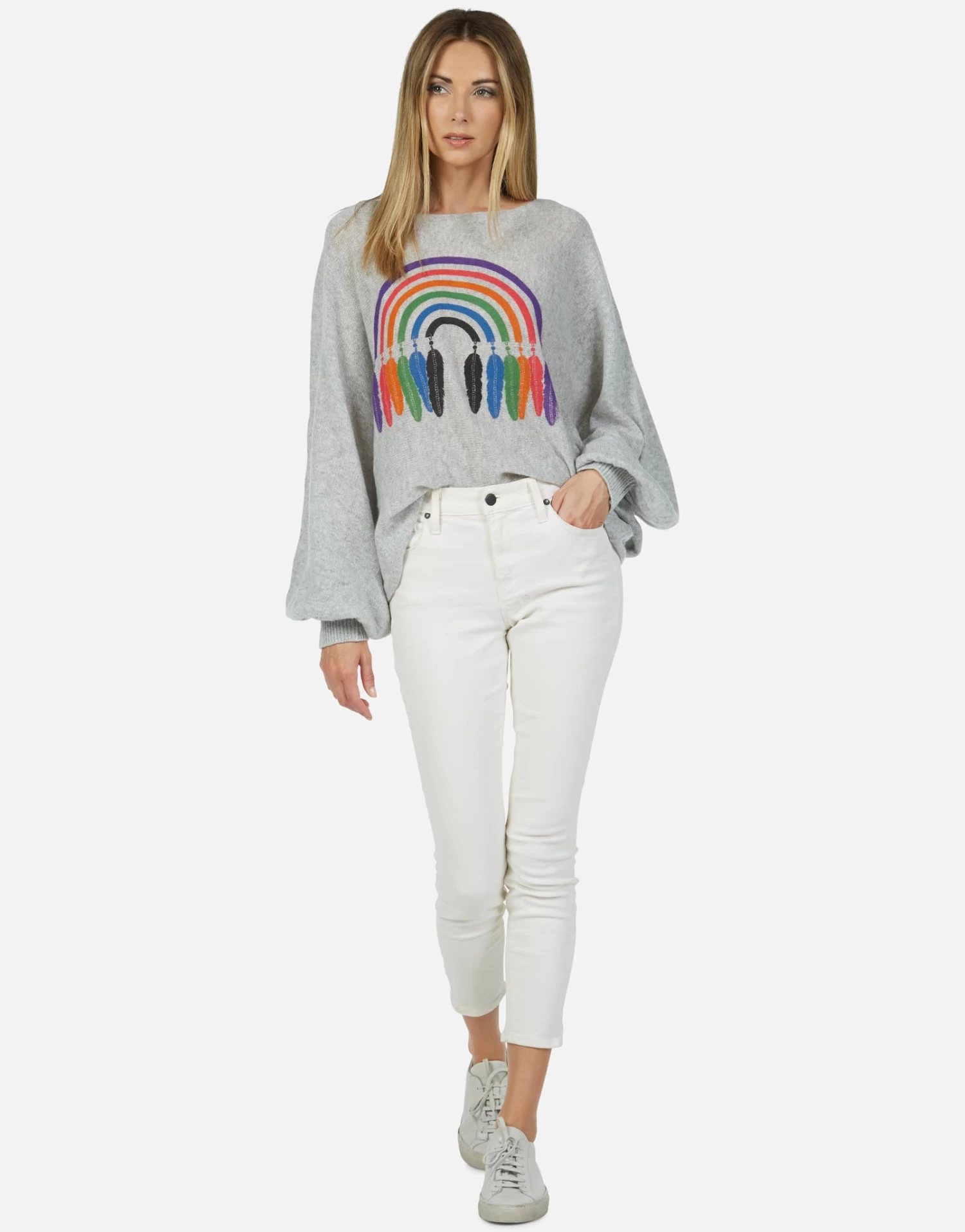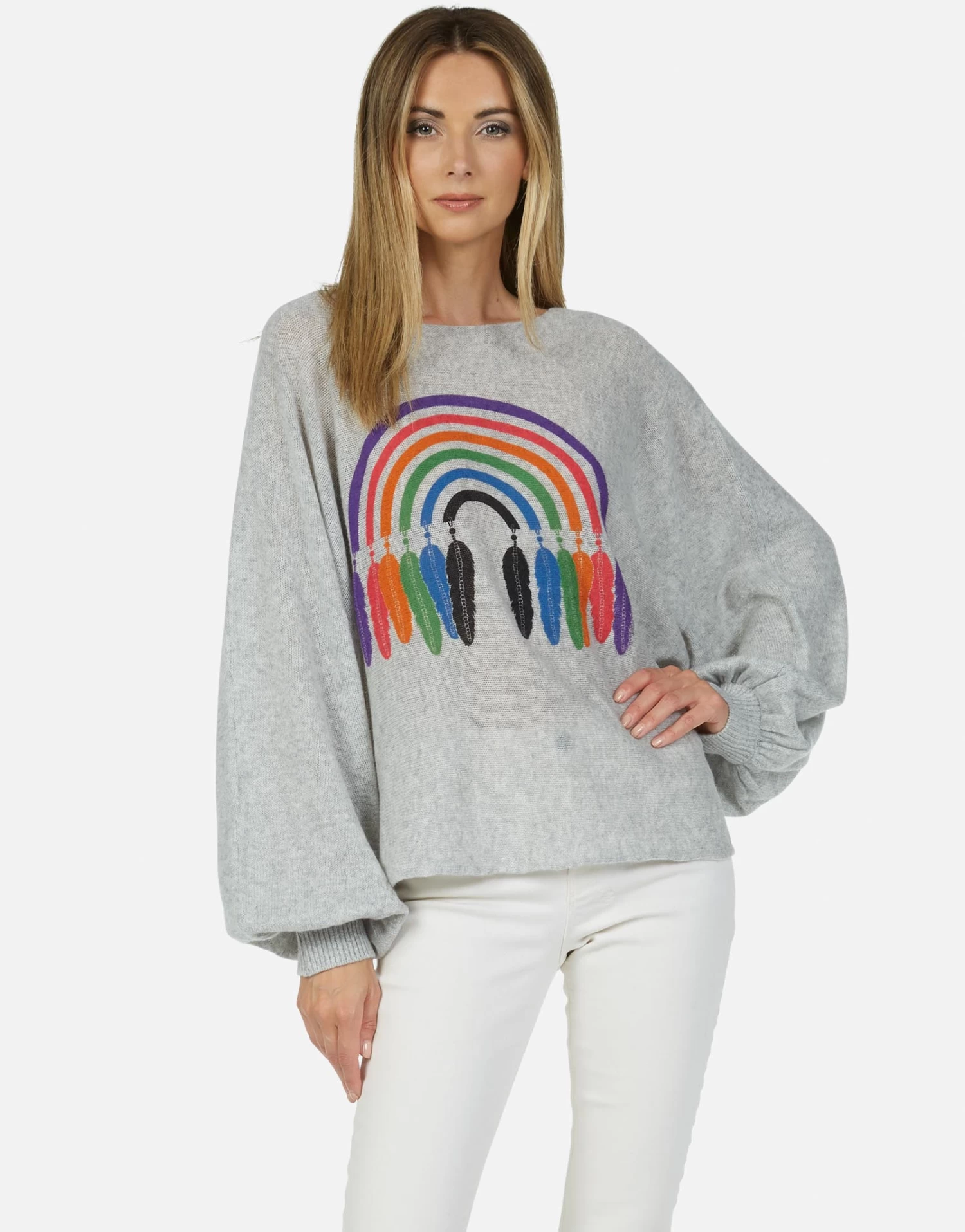 Feather Rainbow Printed on Ultra Soft Cashmere Sweater in Heather Grey by Lauren Moshi.