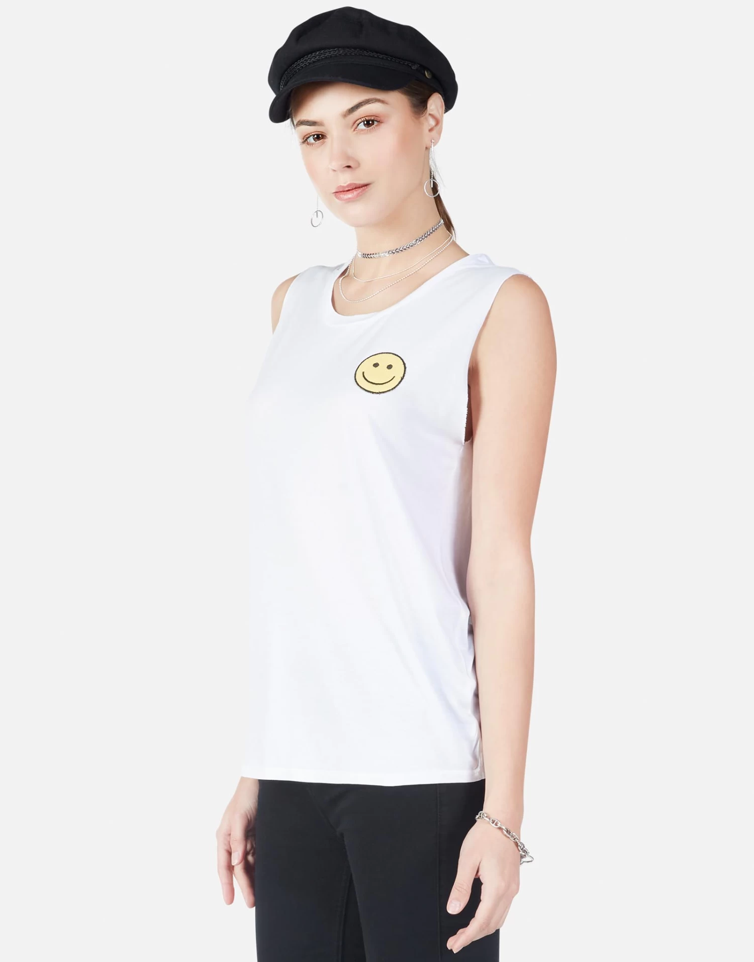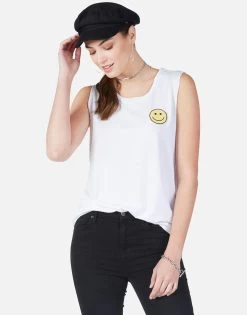 Yellow Happyface Patch on Ultra Soft Lightweight Tank in White by Lauren Moshi.