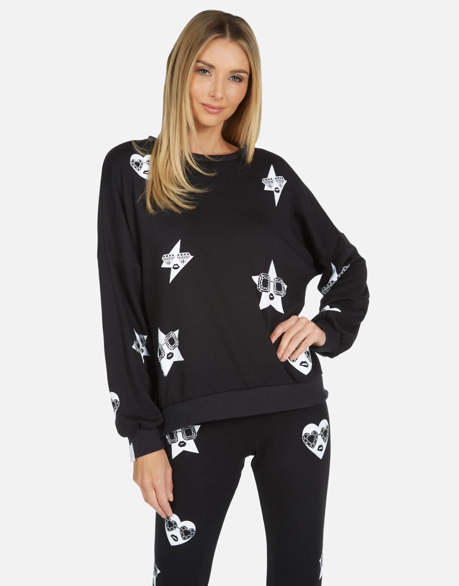 Mini Bling Faces Printed on Ultra Soft Lightweight Pullover in Black by Lauren Moshi.