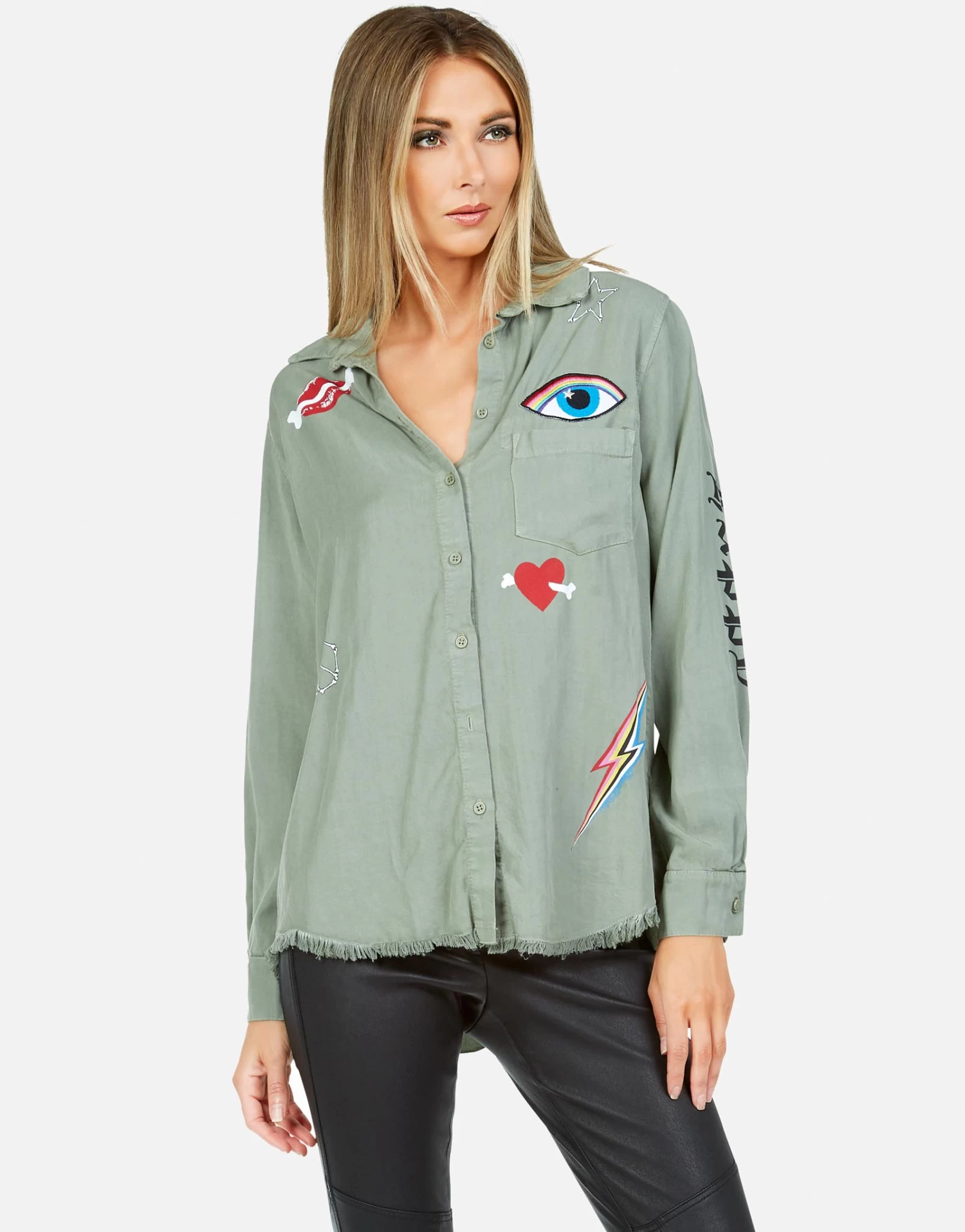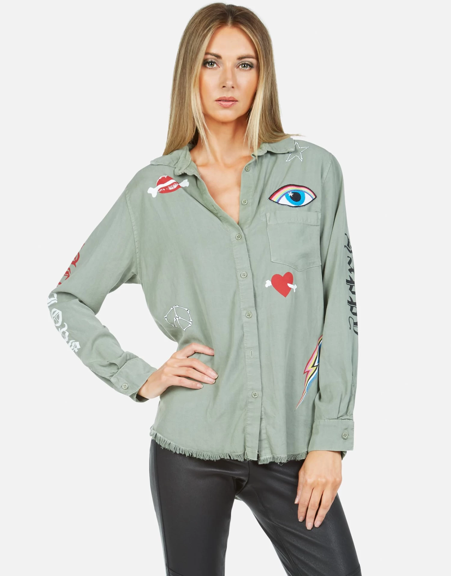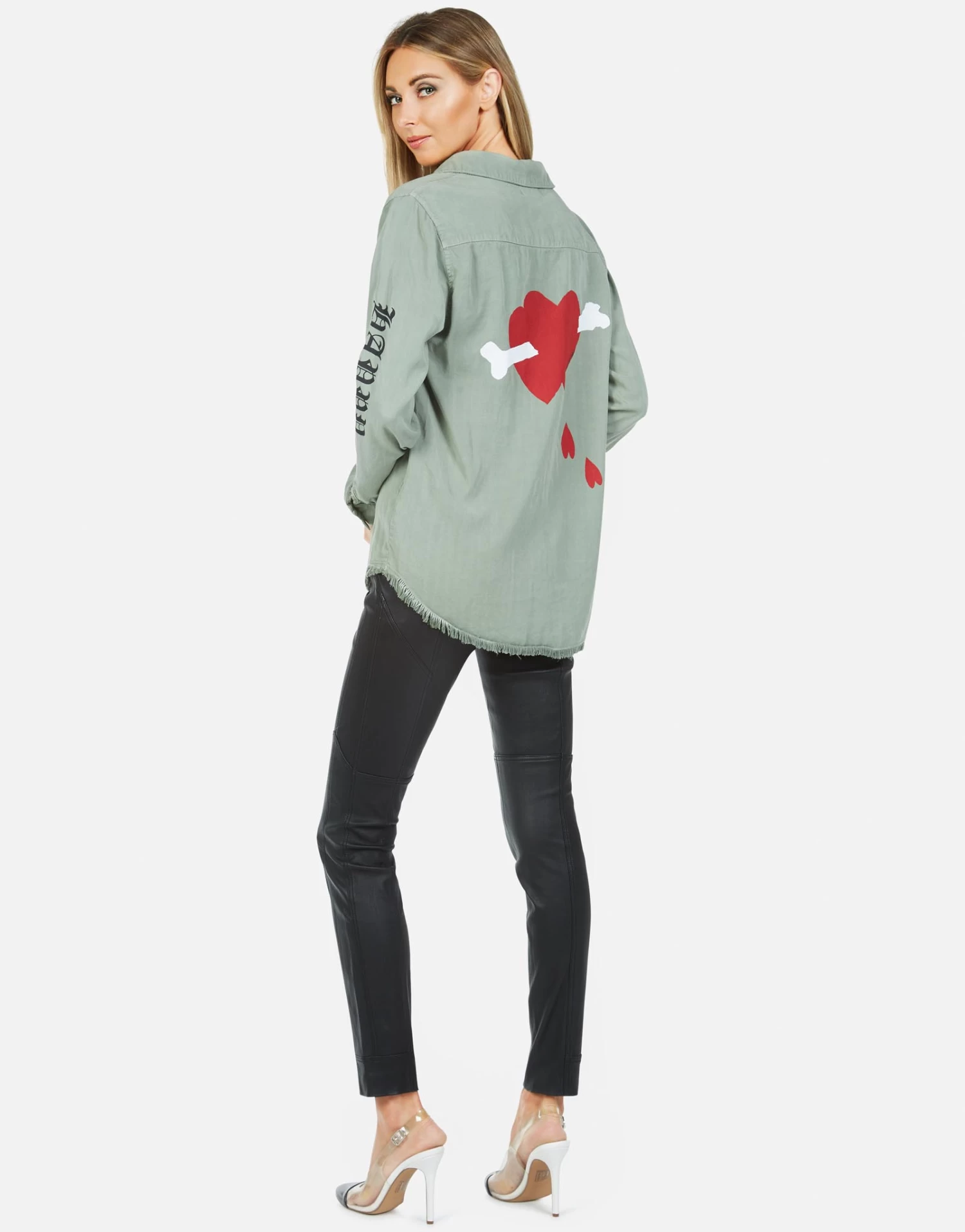 Bone Elements Printed on Ultra Soft Lightweight Button Up Shirt in Pine Green by Lauren Moshi.