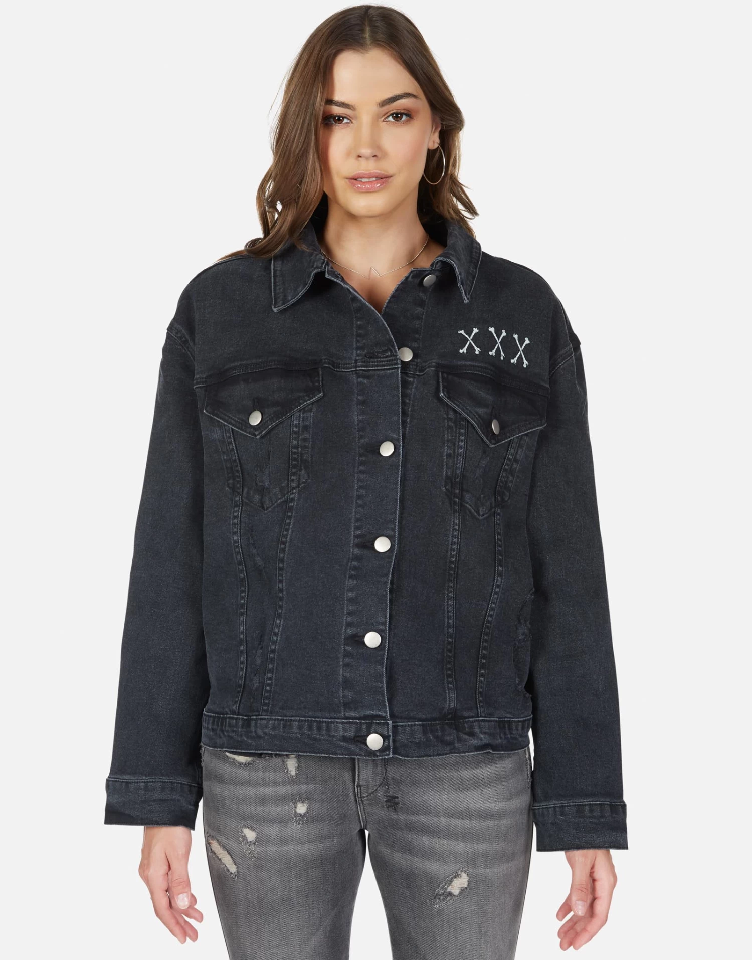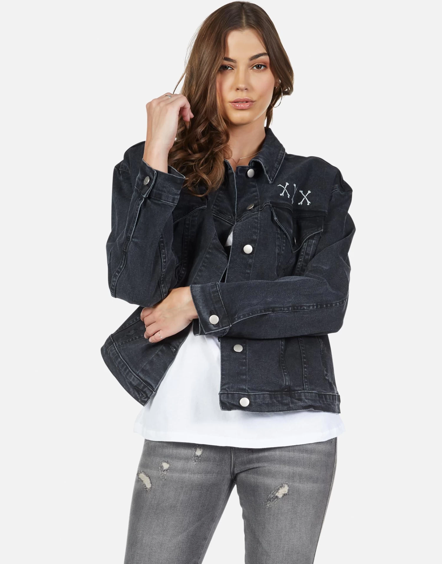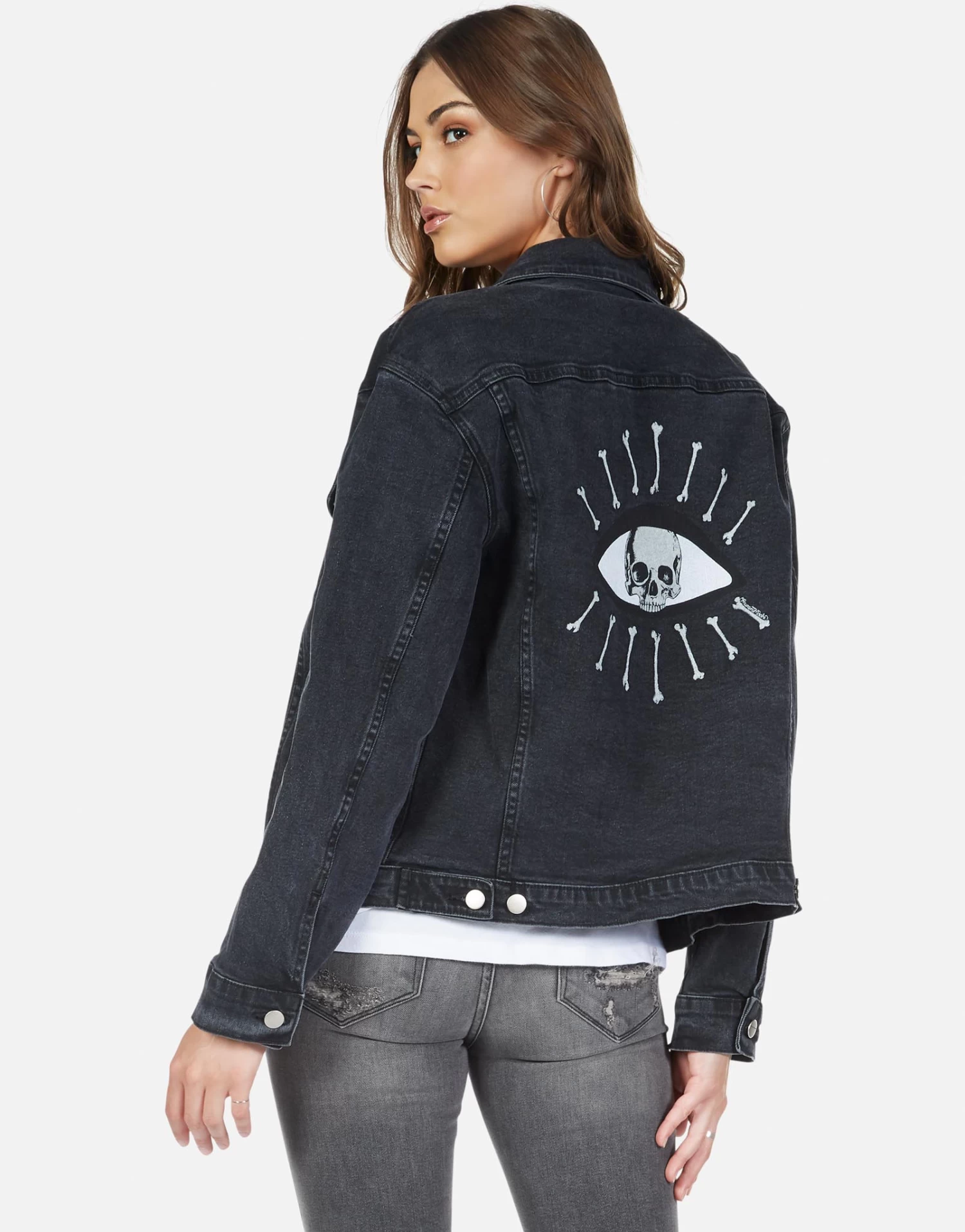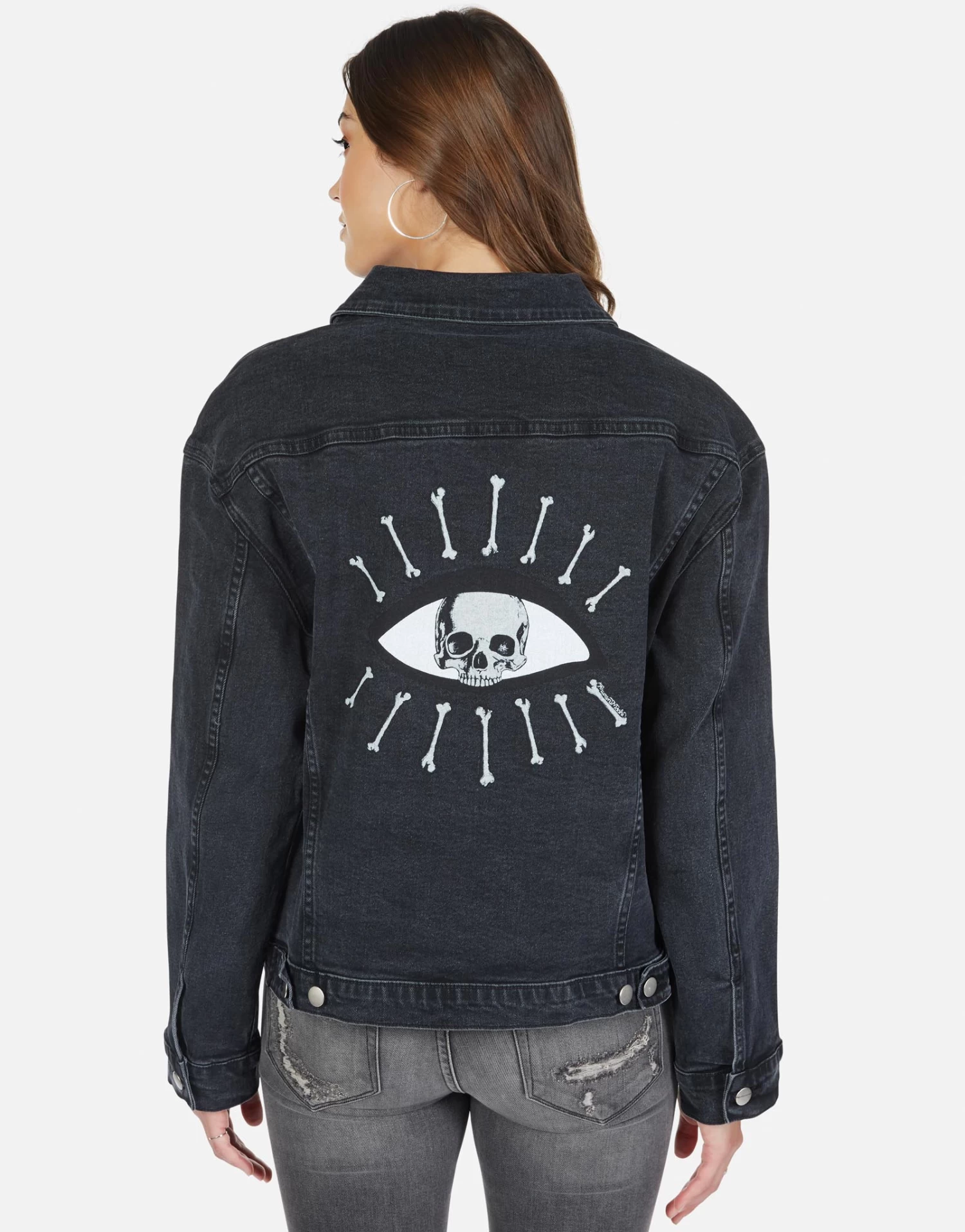 Skull Bone Eye Printed on Women’s Boyfriend Denim Jacket in Vintage Black by Lauren Moshi.