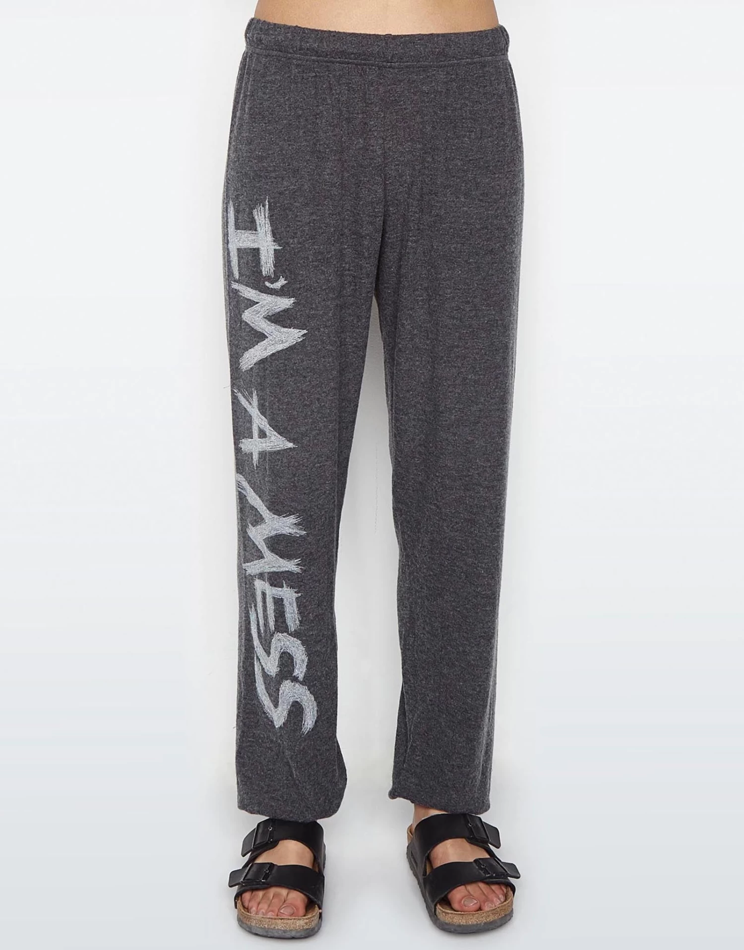 I’m A Mess Printed on Ultra Soft Lightweight Sweatpant in Heather Black by Lauren Moshi.