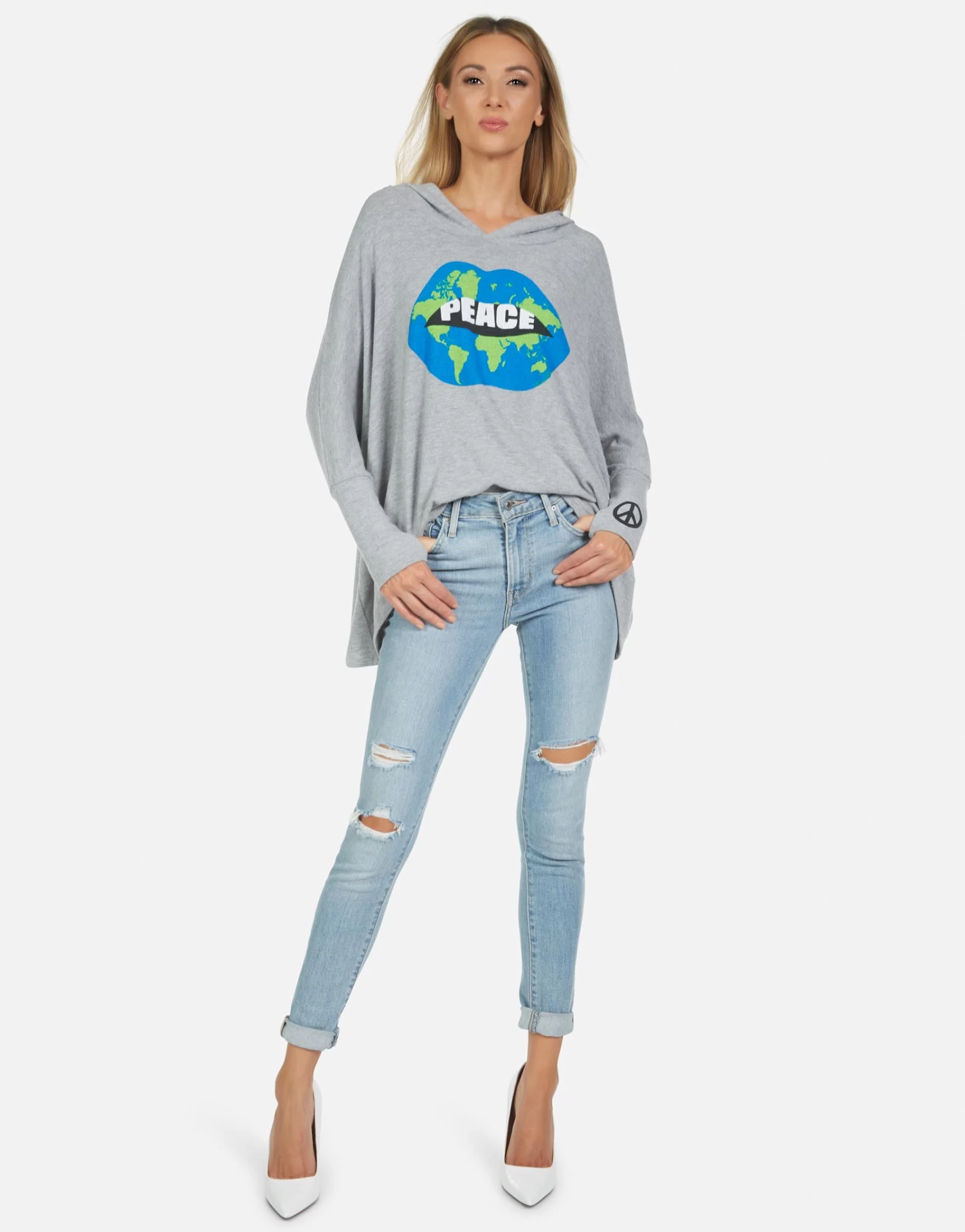 World Peace Lips Printed on Ultra Soft Lightweight Hoodie in Heather Grey by Lauren Moshi.