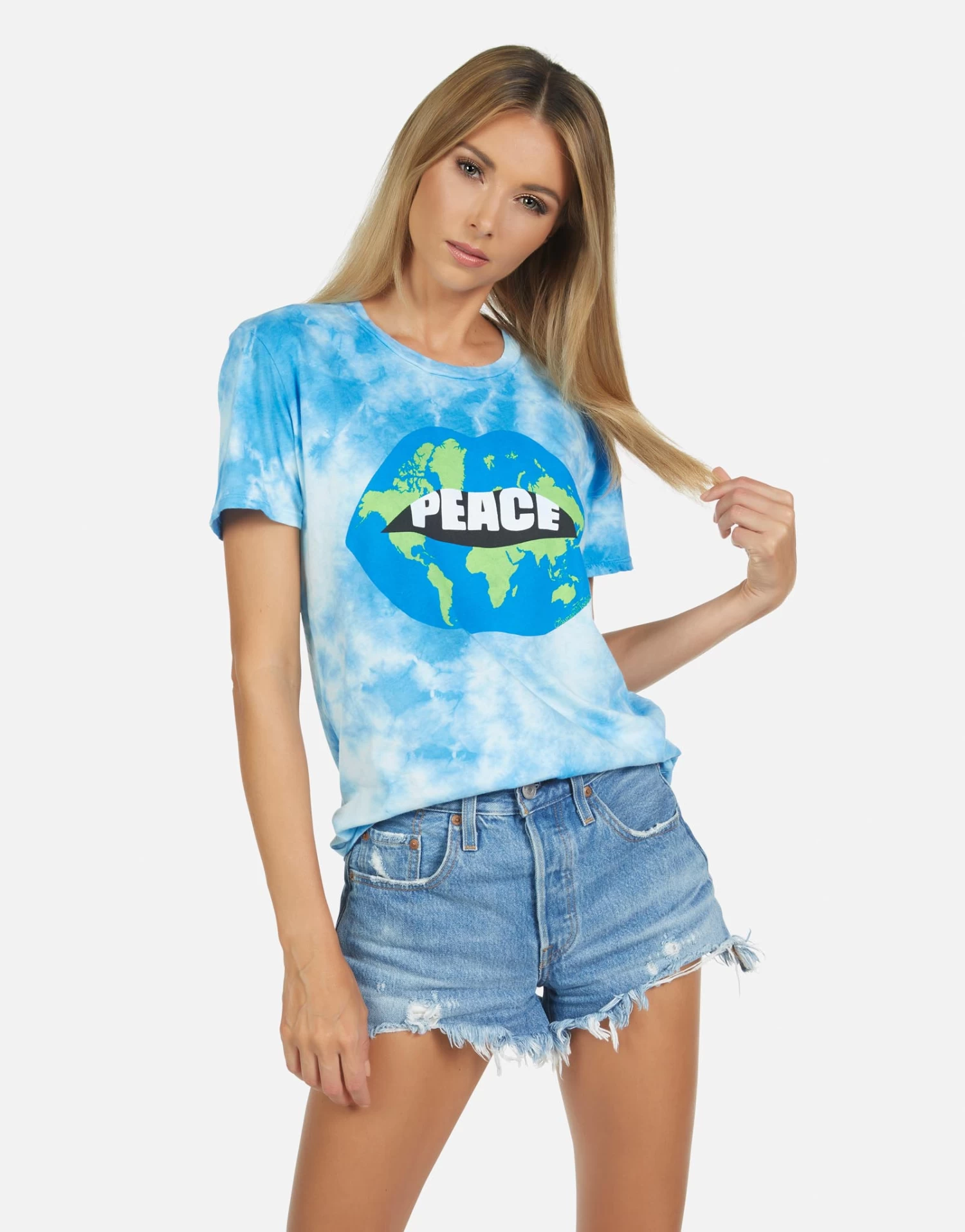 World Peace Lips Printed on Ultra Soft Lightweight Tee in Blue Clouds by Lauren Moshi.