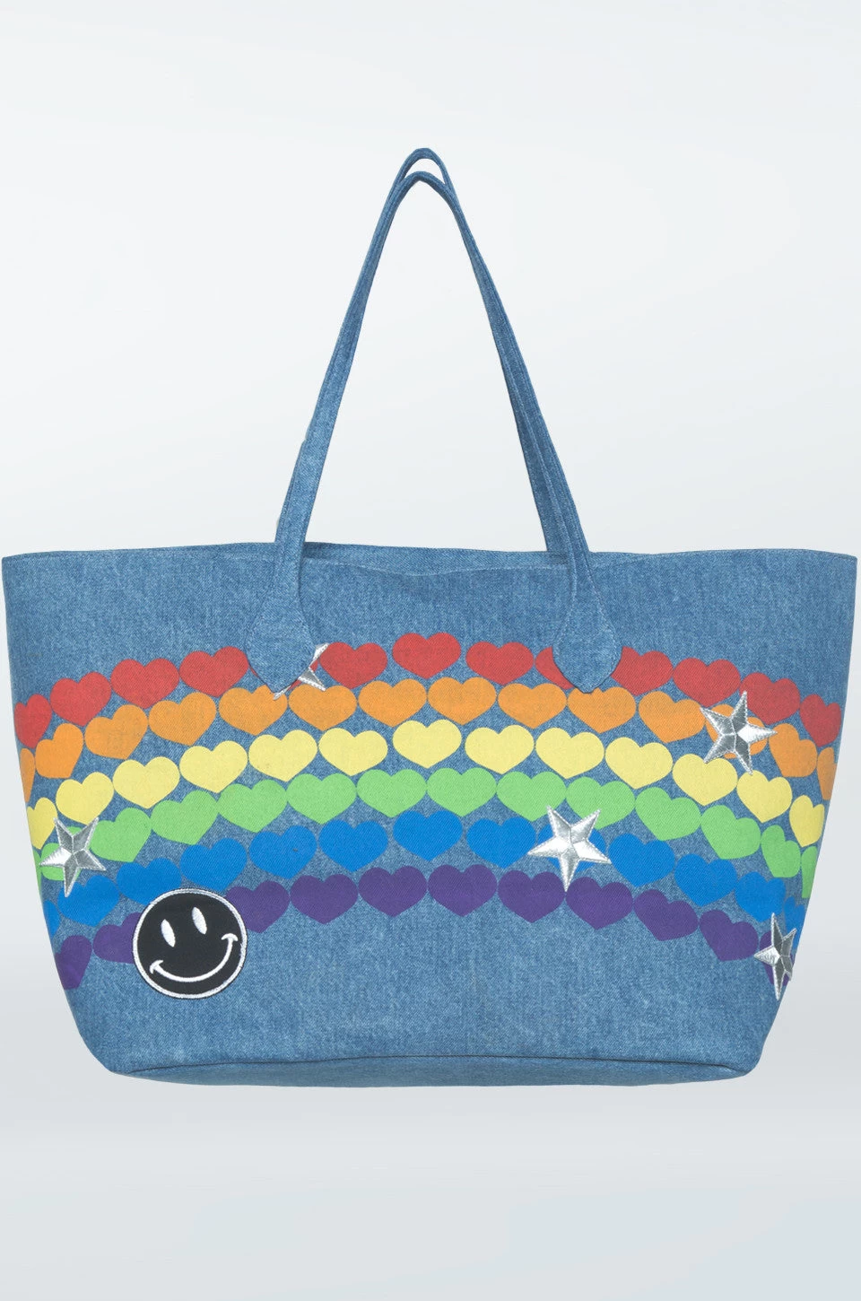 Printed Rainbow Heart with Metallic Star Happyface Tote Bag in Hada Mada Denim. Limited Quantities Available on this Lauren Moshi Web Exclusive!